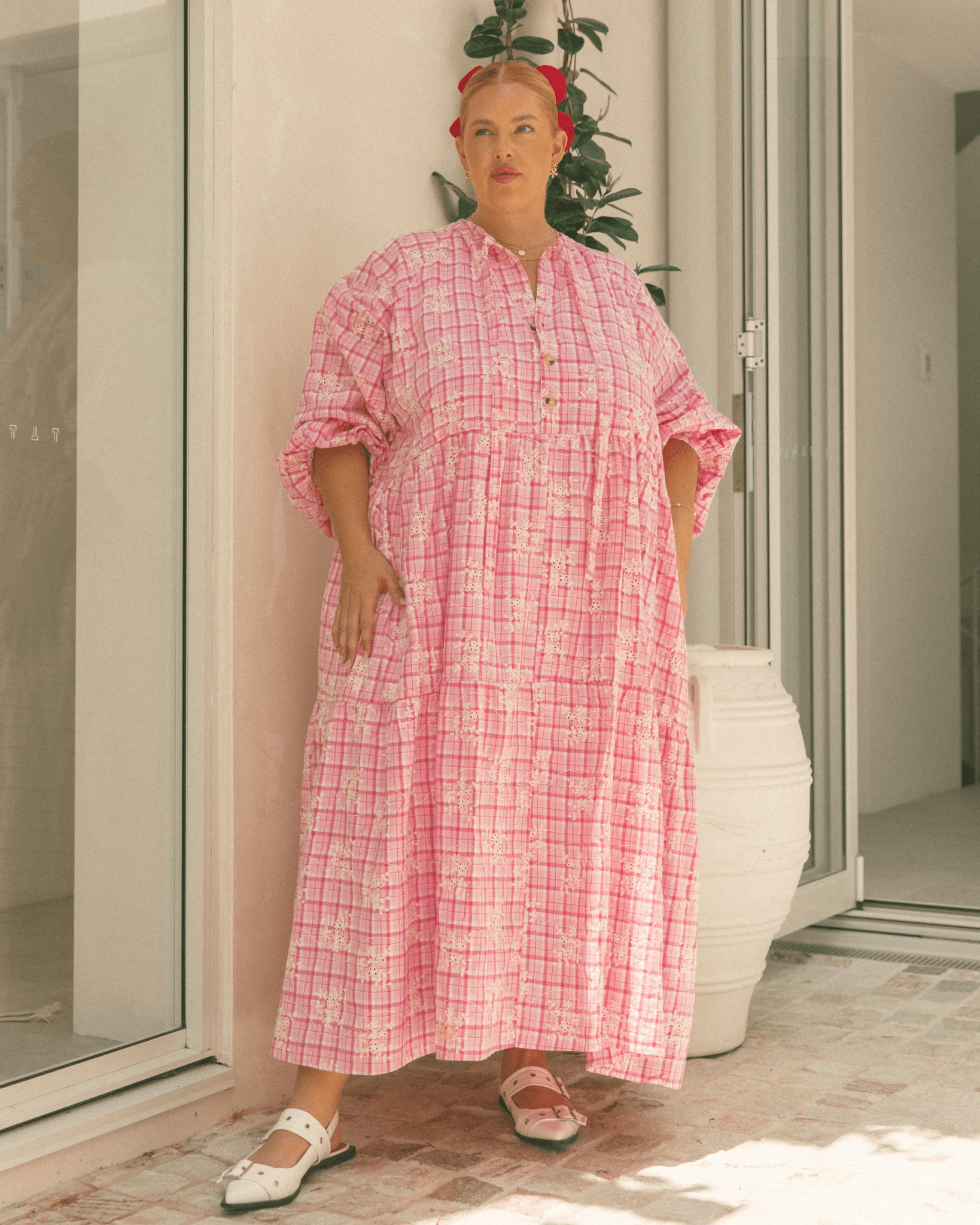 Maxi Avalon Smock Dress | Pink Gingham Embroidery