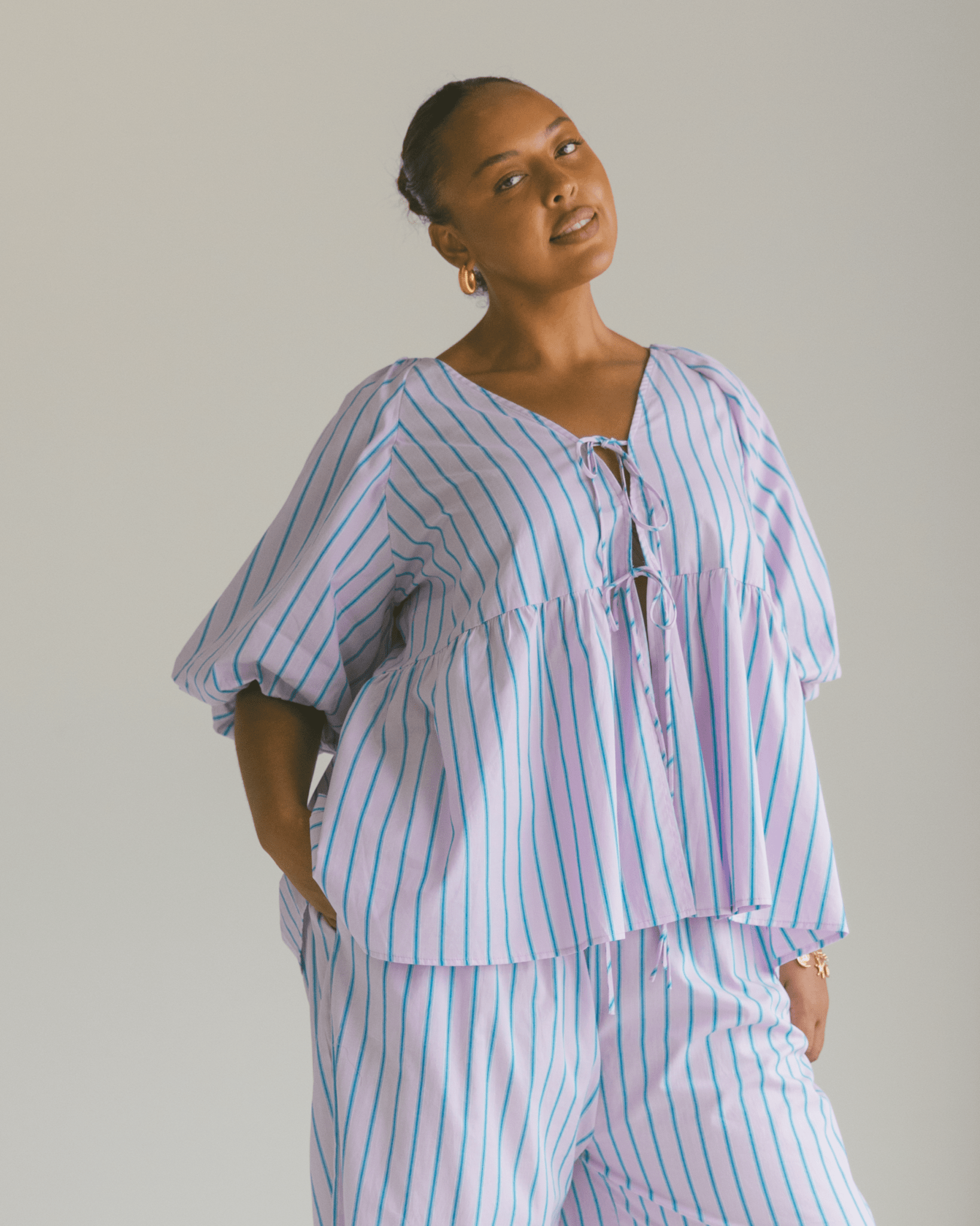 Meet the Frankie Top, a timeless piece designed for effortless style and comfort. Made from 100% cotton, this top is lightweight and breathable—perfect for every season. The playful Purple and blue stripe adds a fresh, vibrant touch, while the oversized smock silhouette provides a relaxed, easy fit.