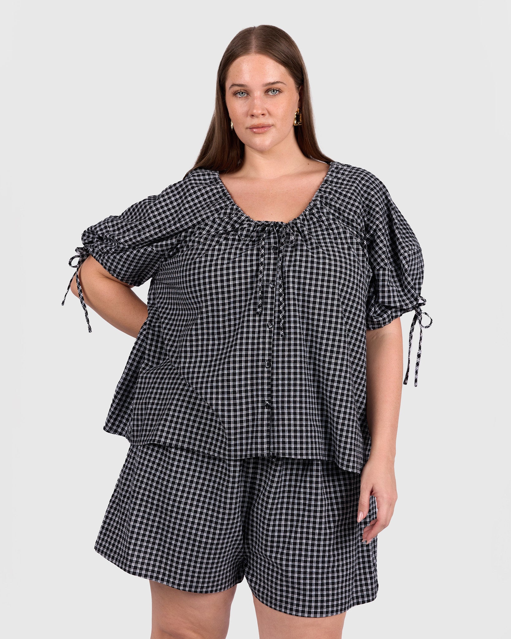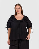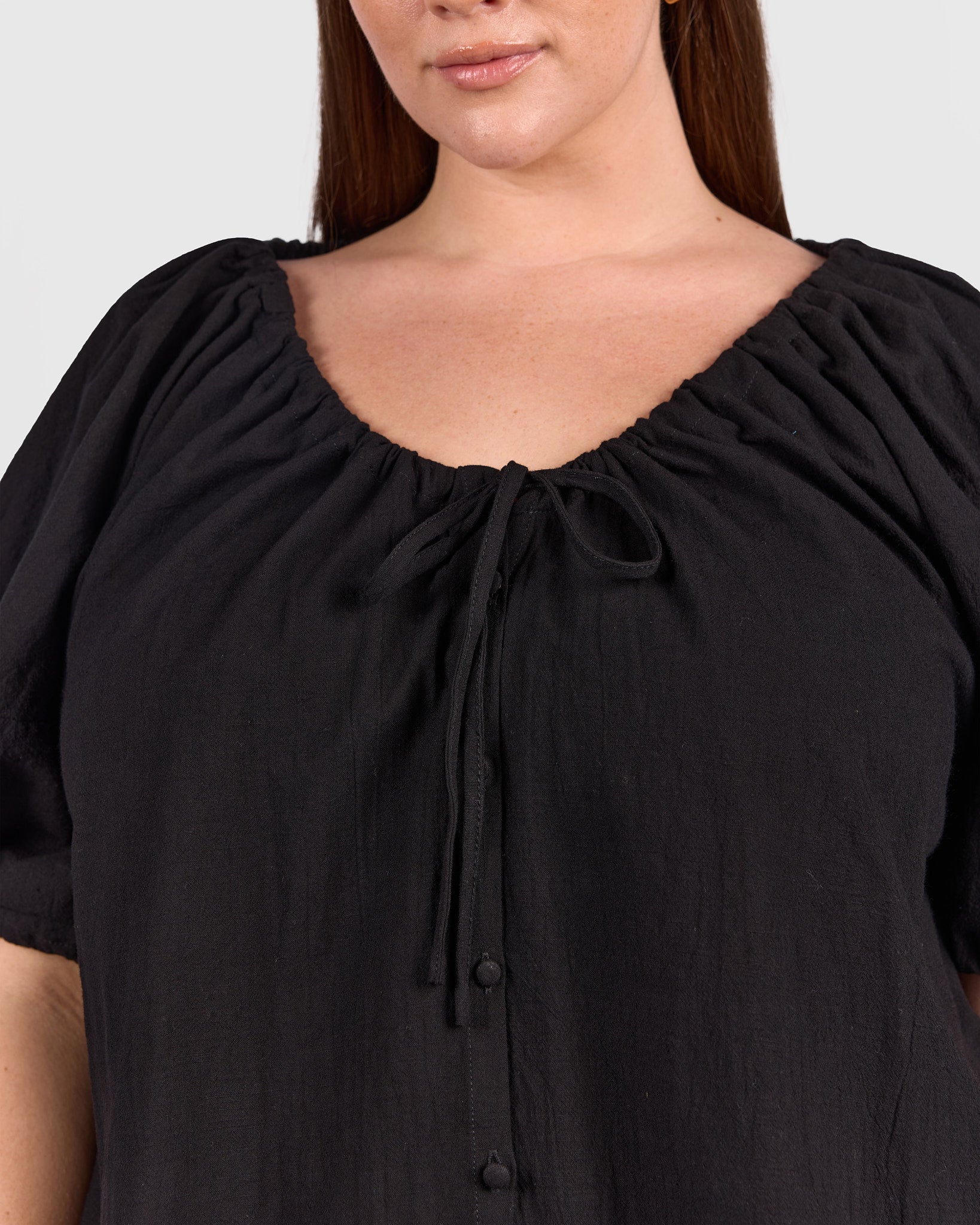 Designed with an adjustable drawstring neckline, you can customise the shape to suit your style. The billowing puff sleeves feature tie details for added volume and flexibility, while the functional fabric-covered buttons down the front make it breastfeeding-friendly and accessible. Finished with a curved hem and slightly longer back for extra coverage, it is relaxed, flattering, and bump-friendly.