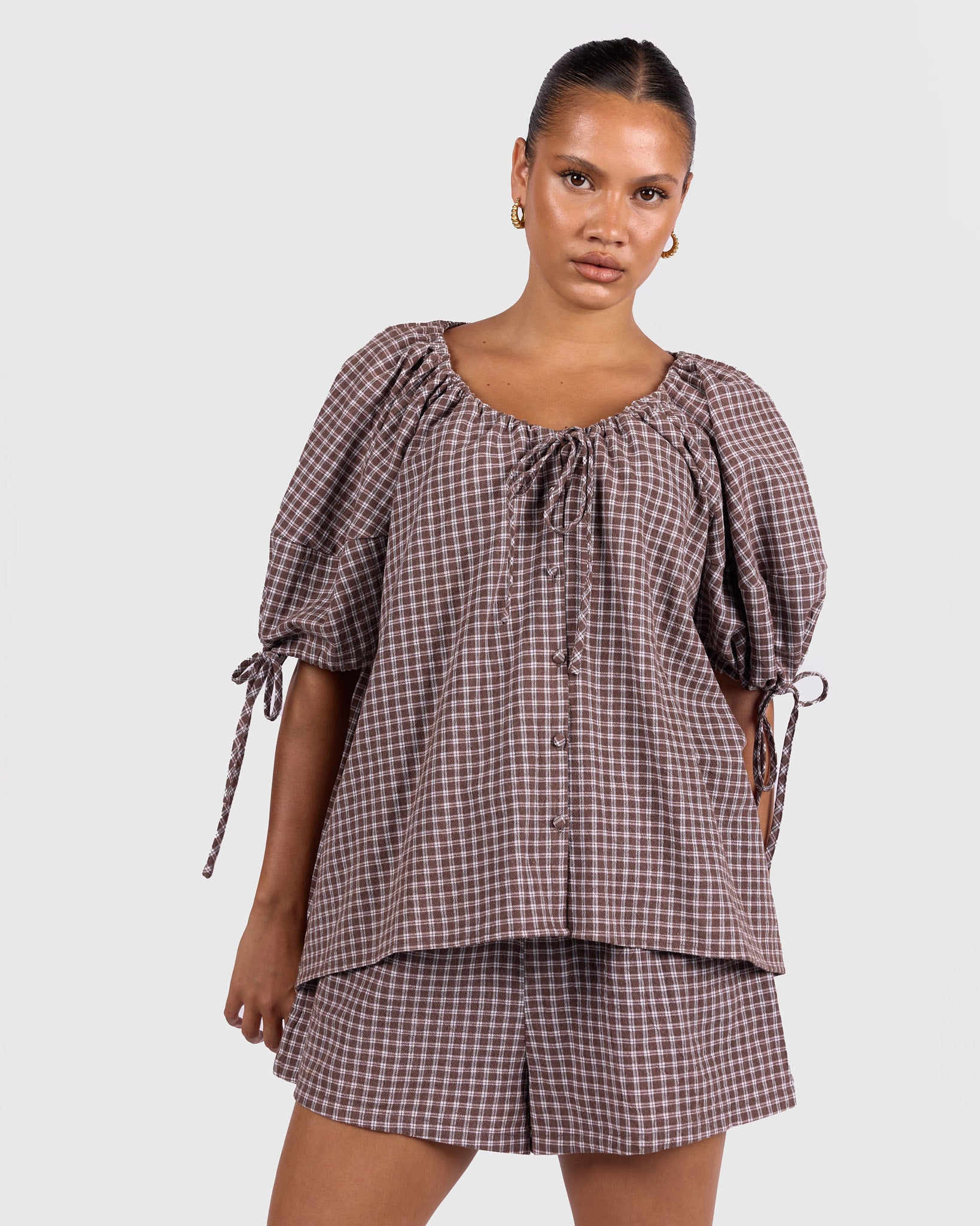 Designed with a soft drawstring neckline, this top allows you to adjust the fit and shape to suit your style. The billowing puff sleeves feature adjustable ties, adding volume while keeping things comfortable. Functional fabric-covered buttons down the front make it breastfeeding-friendly and accessible, while the curved hem with a slightly longer back offers extra coverage where you want it.
