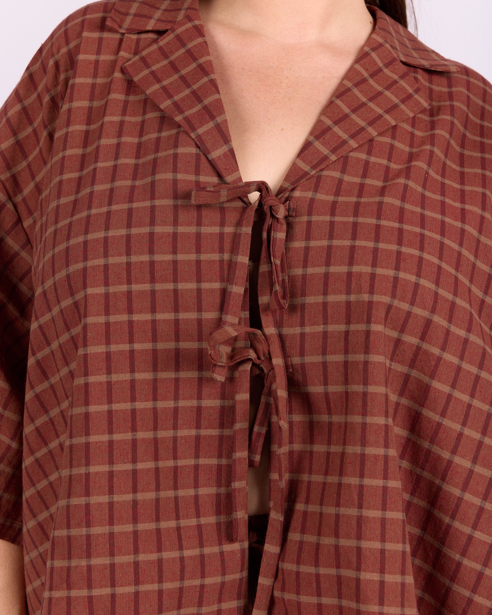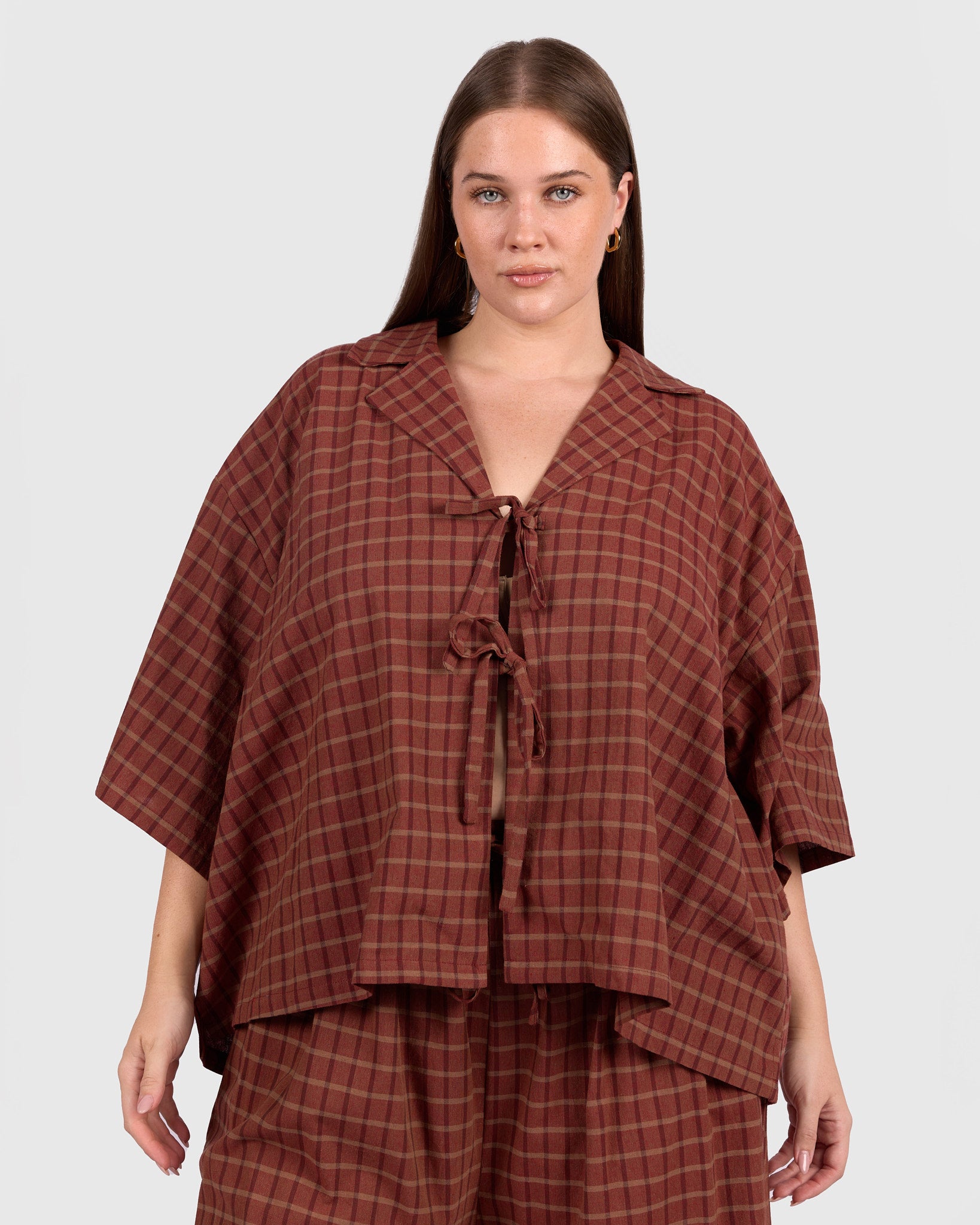 The warm maple gingham print brings a soft, earthy tone that feels timeless and easy to style. Whether paired with matching pieces, denim, or layered over your everyday staples, this is a piece you will keep reaching for.