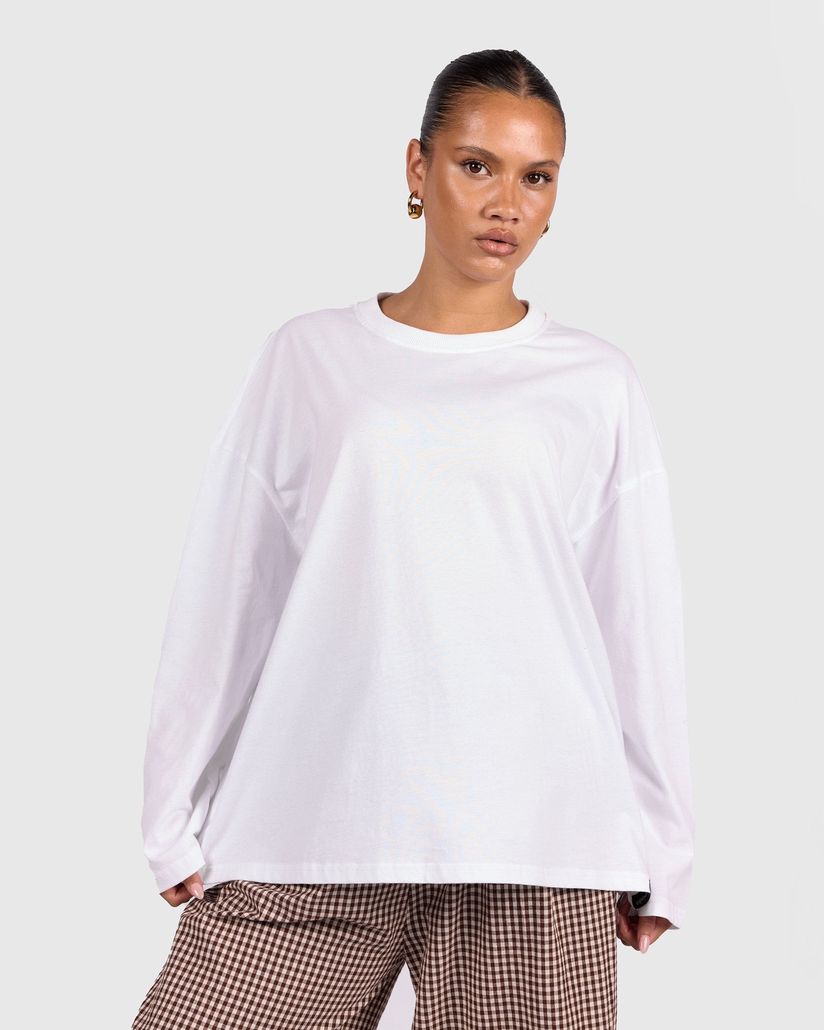 Featuring a relaxed silhouette with dropped shoulders and a ribbed neckline, this long sleeve tee gives you that easy, slightly oversized look without feeling bulky. The unlined cotton keeps it breathable and perfect for layering through every season.