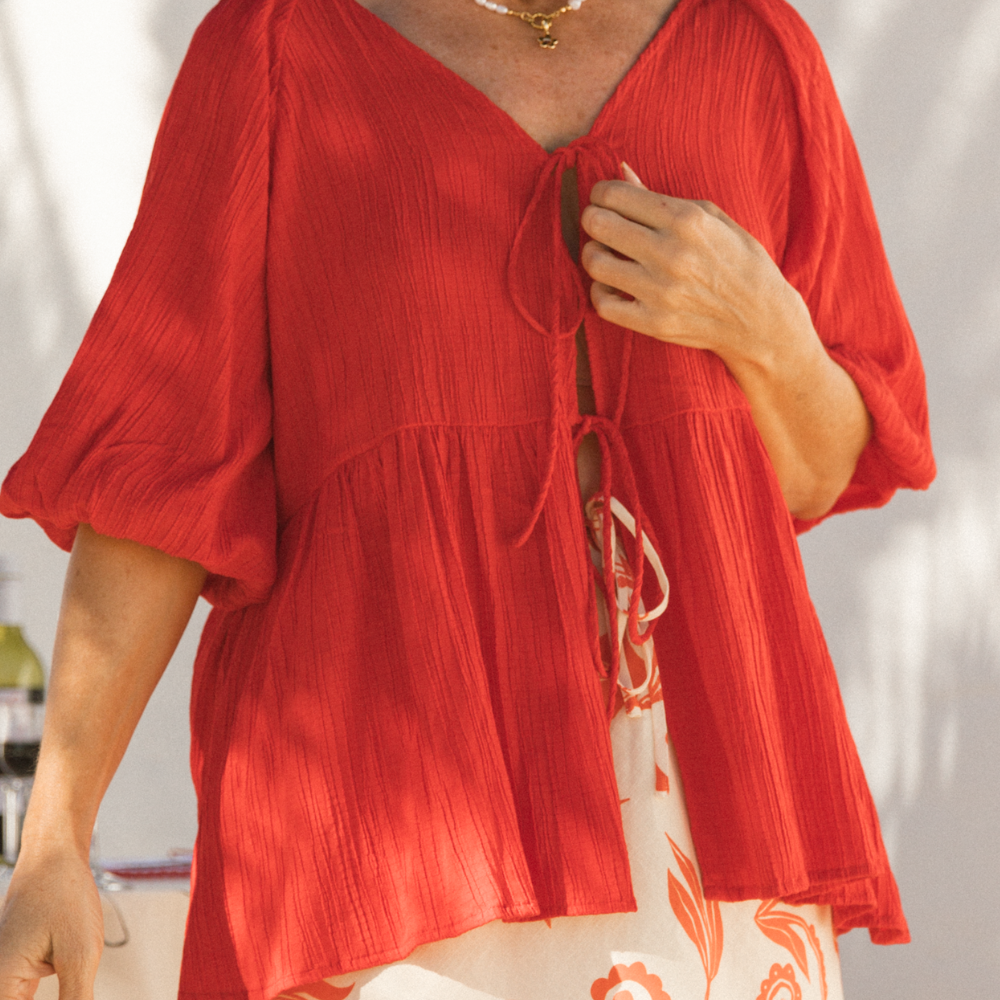 Crafted from a dreamy Viscose & Cotton blend fabric, the Frankie Top is your new everyday go-to with main character charm. Featuring a cross-over bust, floaty puff sleeves, and a cute front-tie moment, she’s breezy, easy, and ready for whatever your day throws at you.