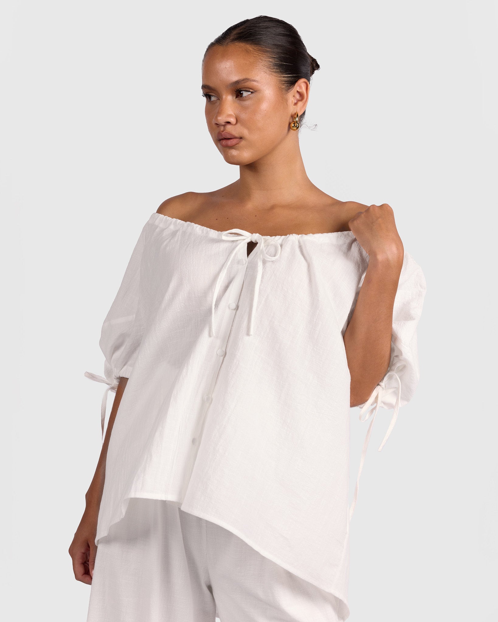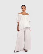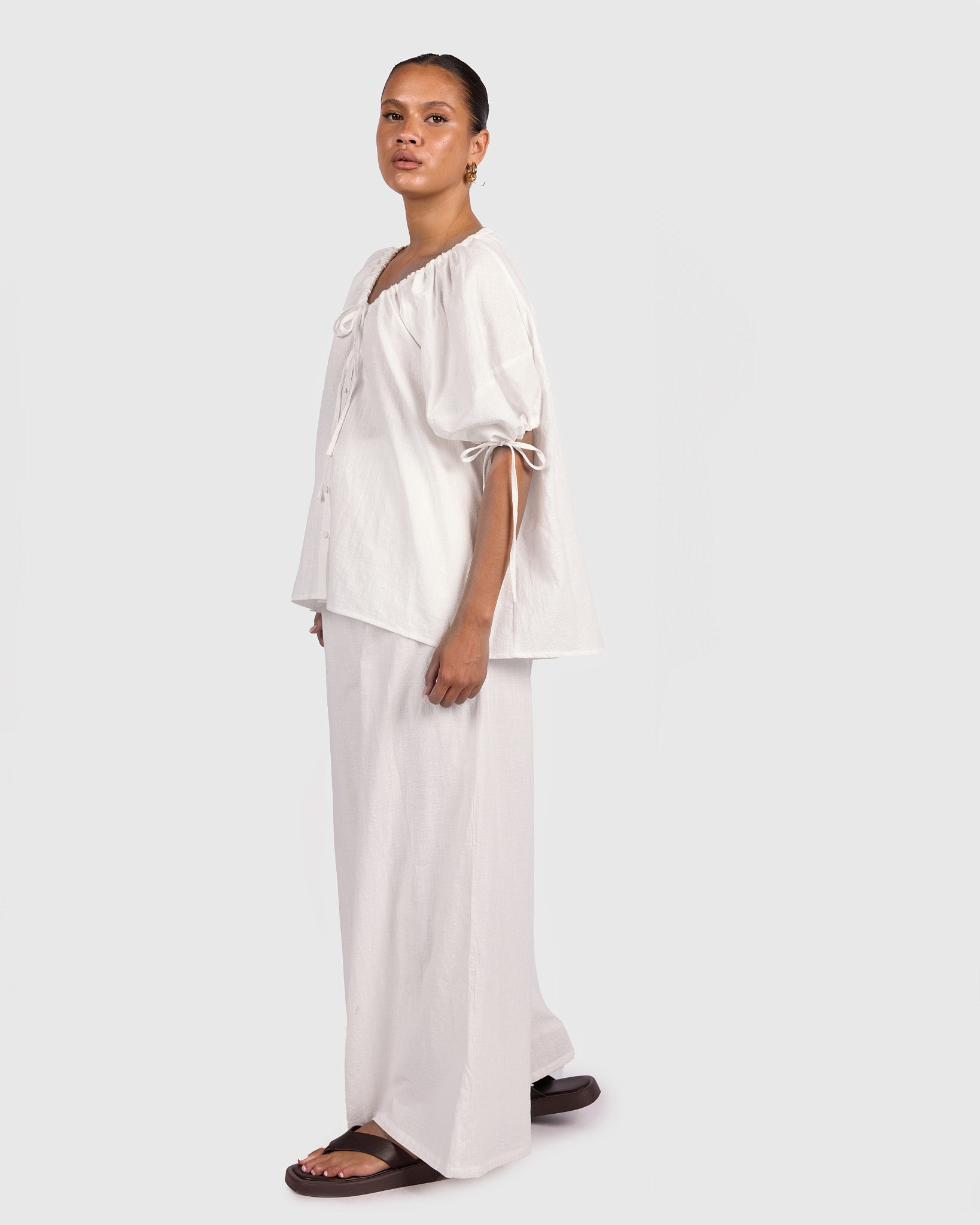 The crisp white tone makes it endlessly versatile. Easy to pair with printed pants, denim, or your favourite lounge pieces, it is the kind of top that works with everything in your wardrobe.