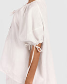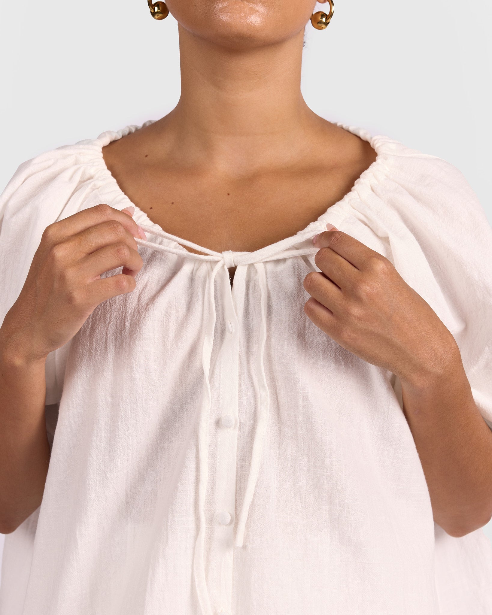 Designed with a soft drawstring neckline, you can adjust the shape to suit your style. The billowing puff sleeves feature adjustable ties for added detail and comfort, while the functional fabric-covered buttons down the front make it breastfeeding-friendly and accessible. Finished with a curved hem and slightly longer back for extra coverage, it is a relaxed, bump-friendly silhouette made for real life.
