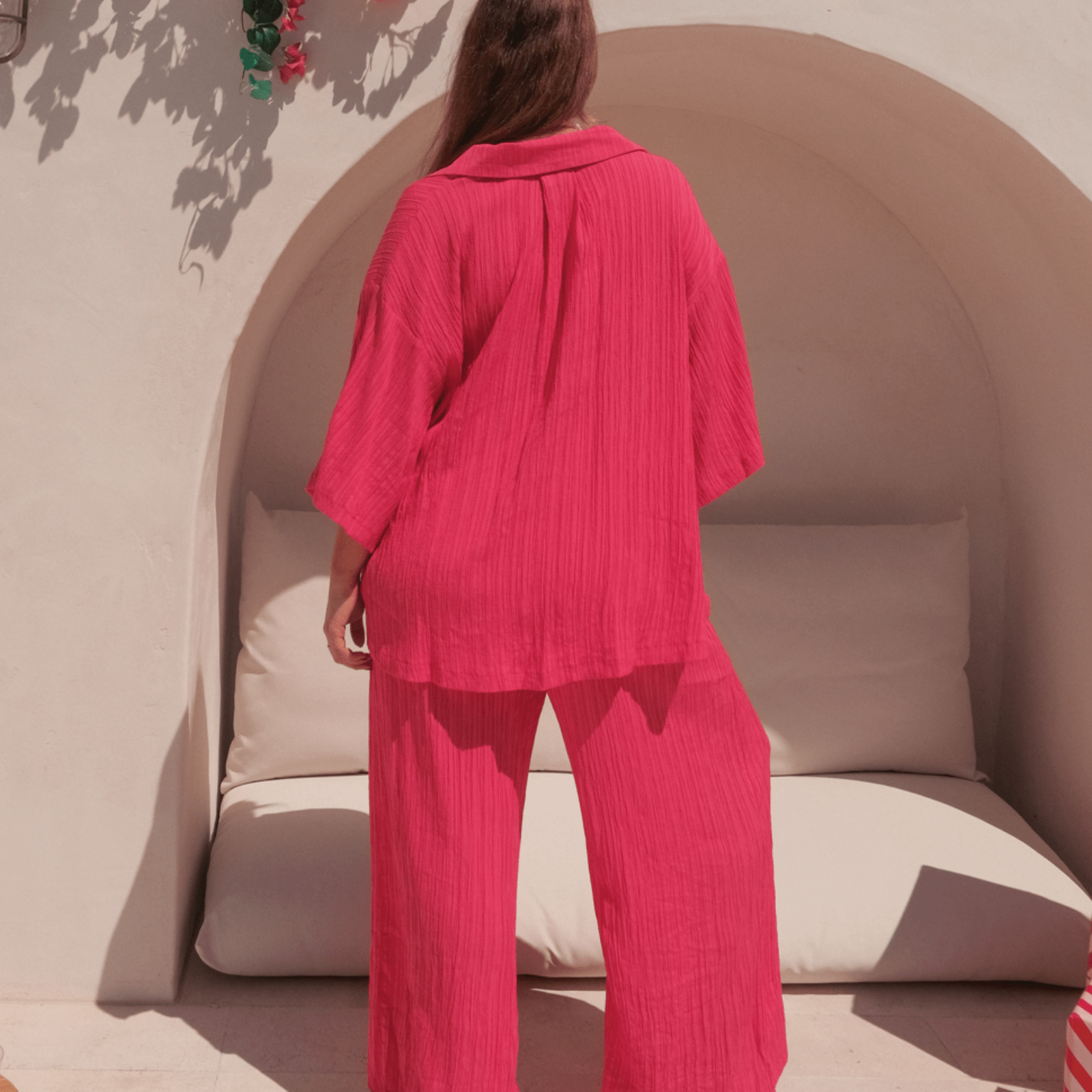 Our Crepe styles are crafted from a beautiful, breathable blend designed for comfort and elegance. Due to the nature of the loose weave, this fabric is more delicate than our cotton and linen pieces and requires extra care to maintain its quality and longevity.