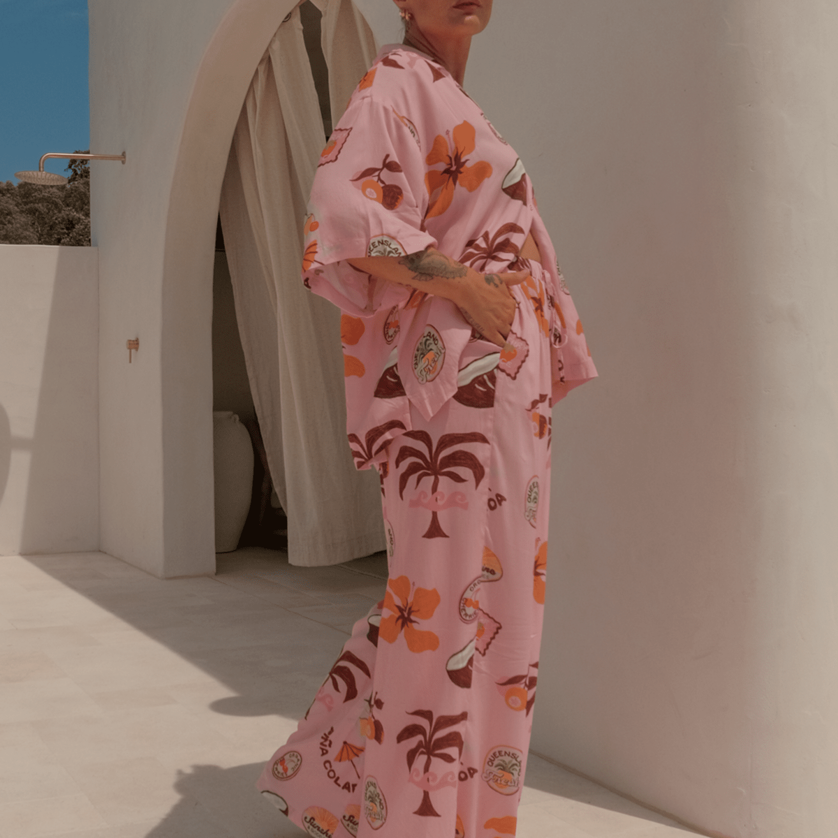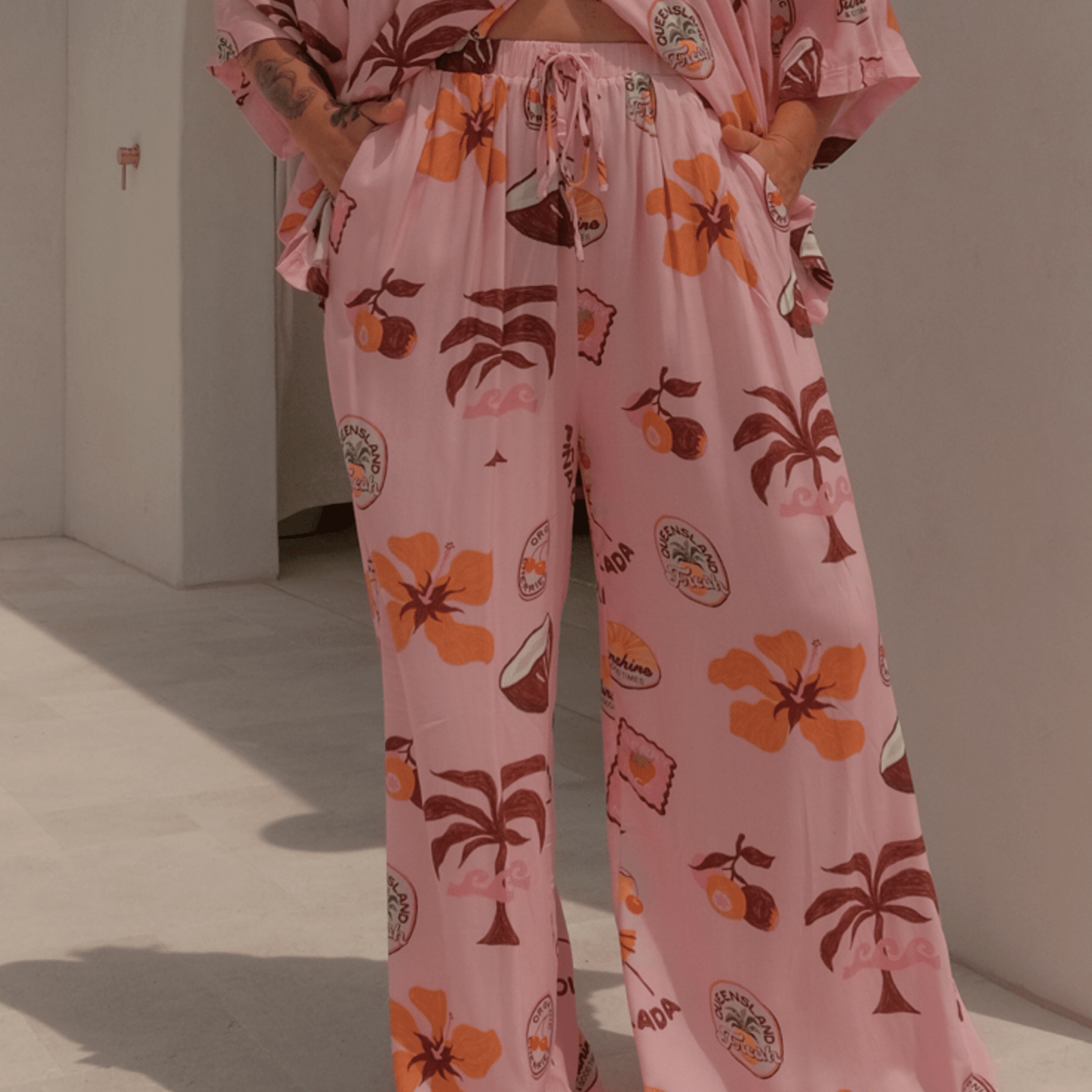 The Posey Pants | Paradise Postcards by The Lullaby Club are the ultimate blend of comfort and style. Designed with a relaxed, oversized fit, these wide-leg pants offer effortless movement and breathability, making them perfect for every occasion—from lounging at home to strolling along the beach.