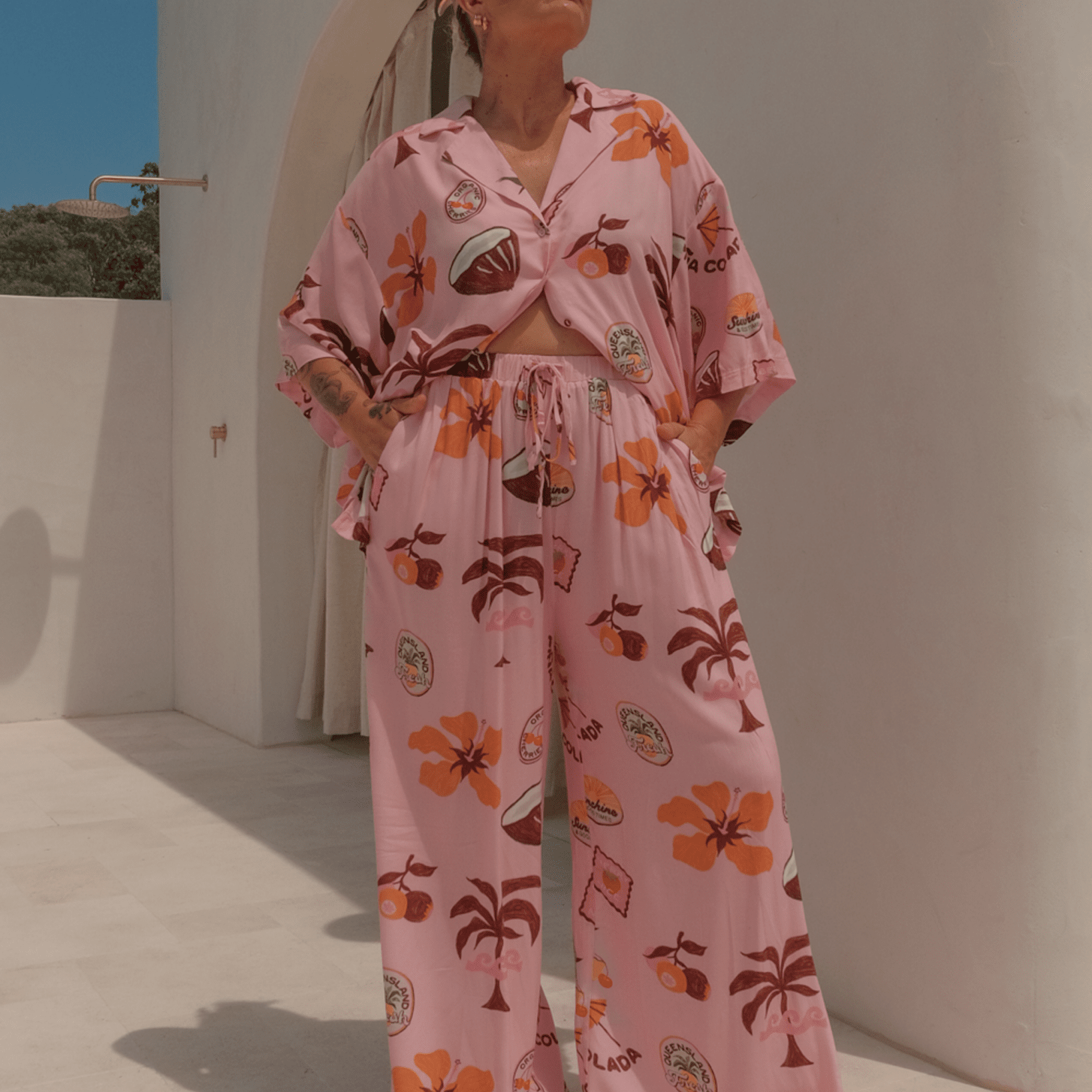 Pair the Posey Pants | Paradise Postcards with a simple fitted top for a laid-back, effortless look or style them with a matching blouse for a boho-inspired co-ord set. Dress them up with heels and layered accessories, or keep it casual with sandals for a relaxed, everyday vibe.