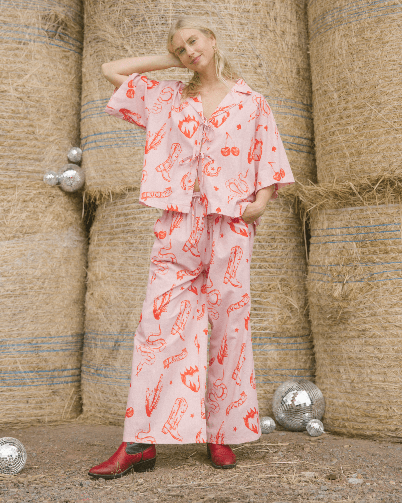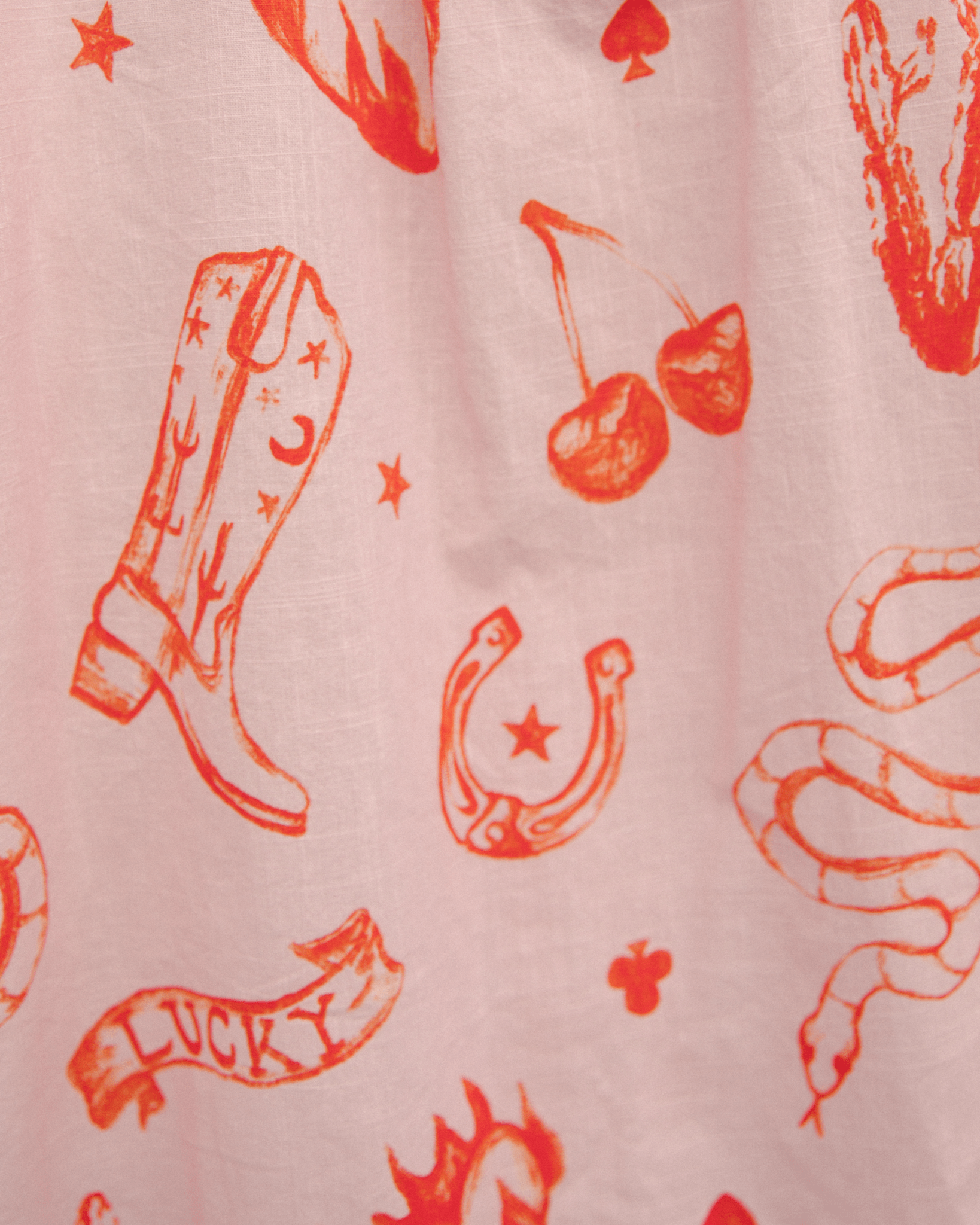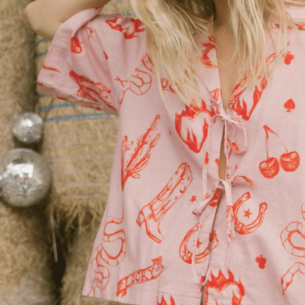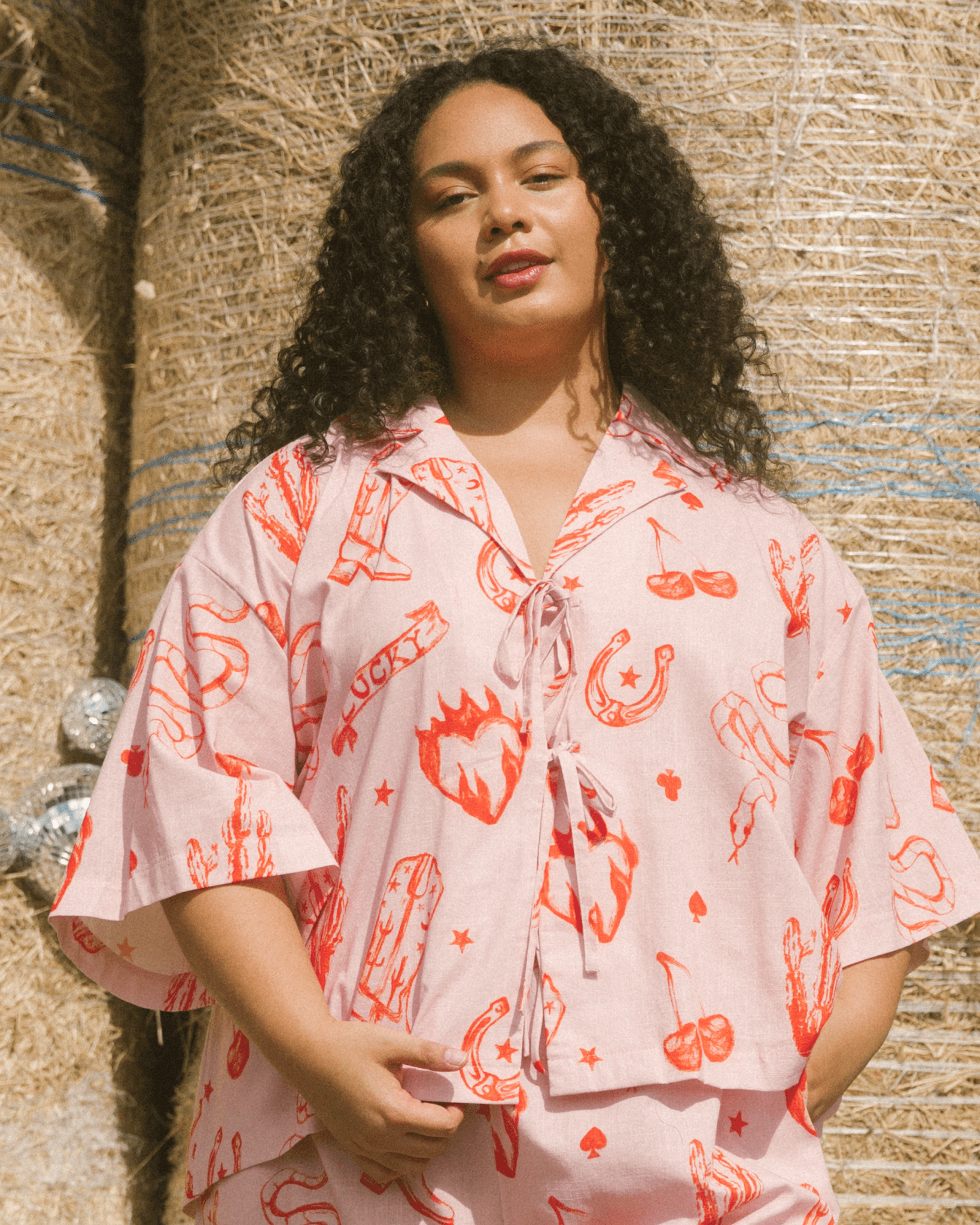 Tied at the front or thrown on open over swimwear — Billie doesn’t try too hard, she just is cool. Featuring our exclusive Wildhearts Parlour print and a breezy silhouette, she’s the kind of piece that instantly upgrades your “just popping out” look to something a little more main-character.