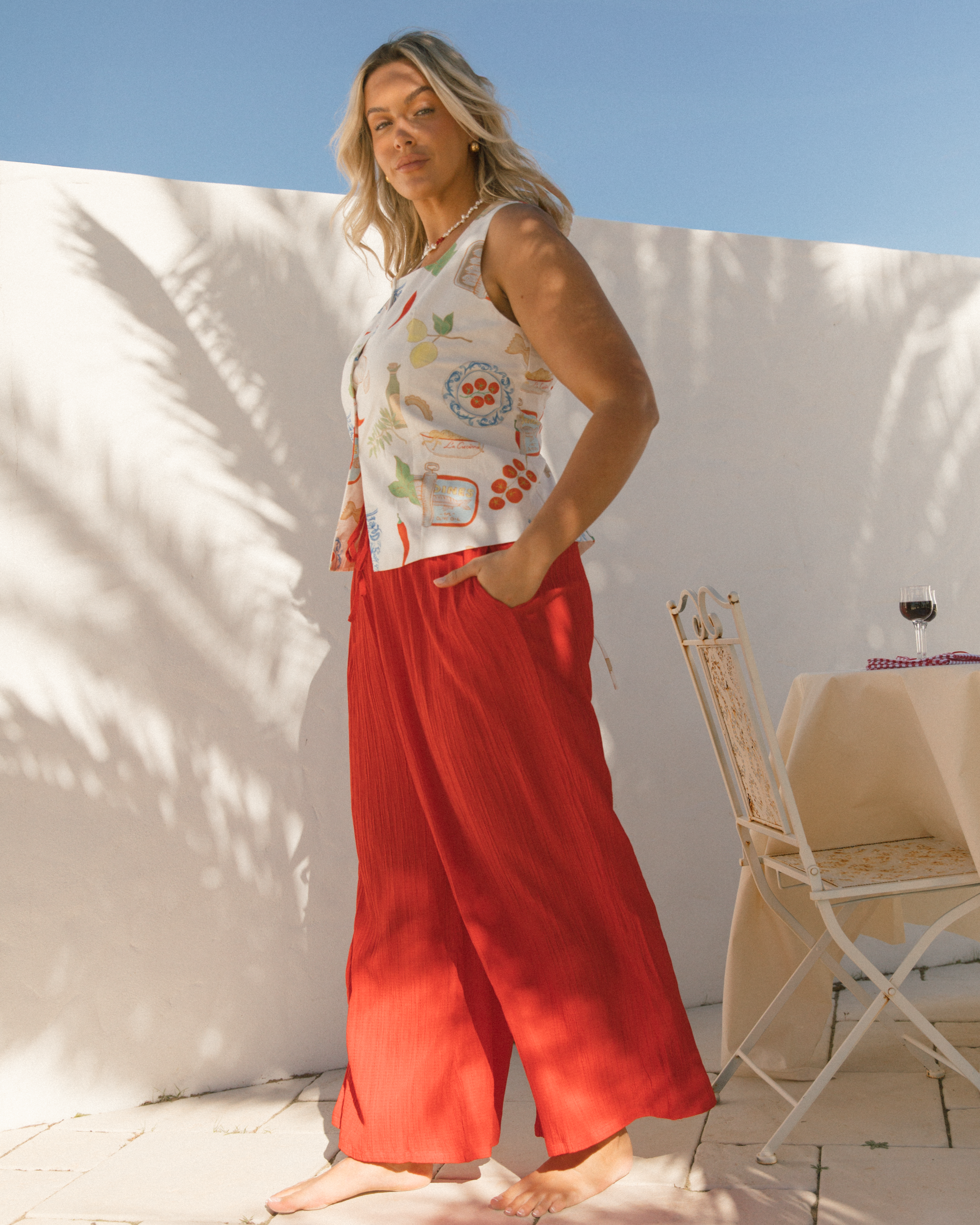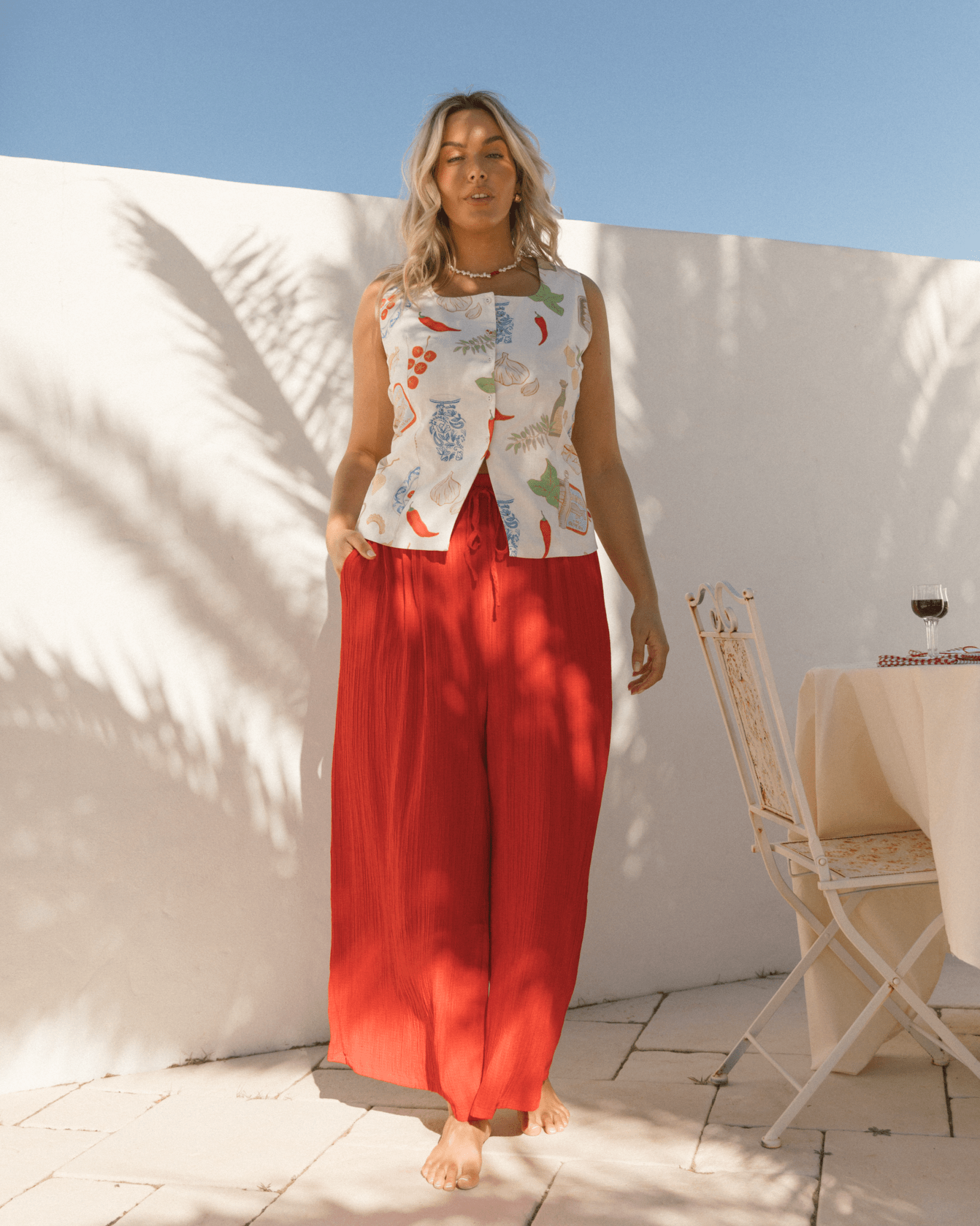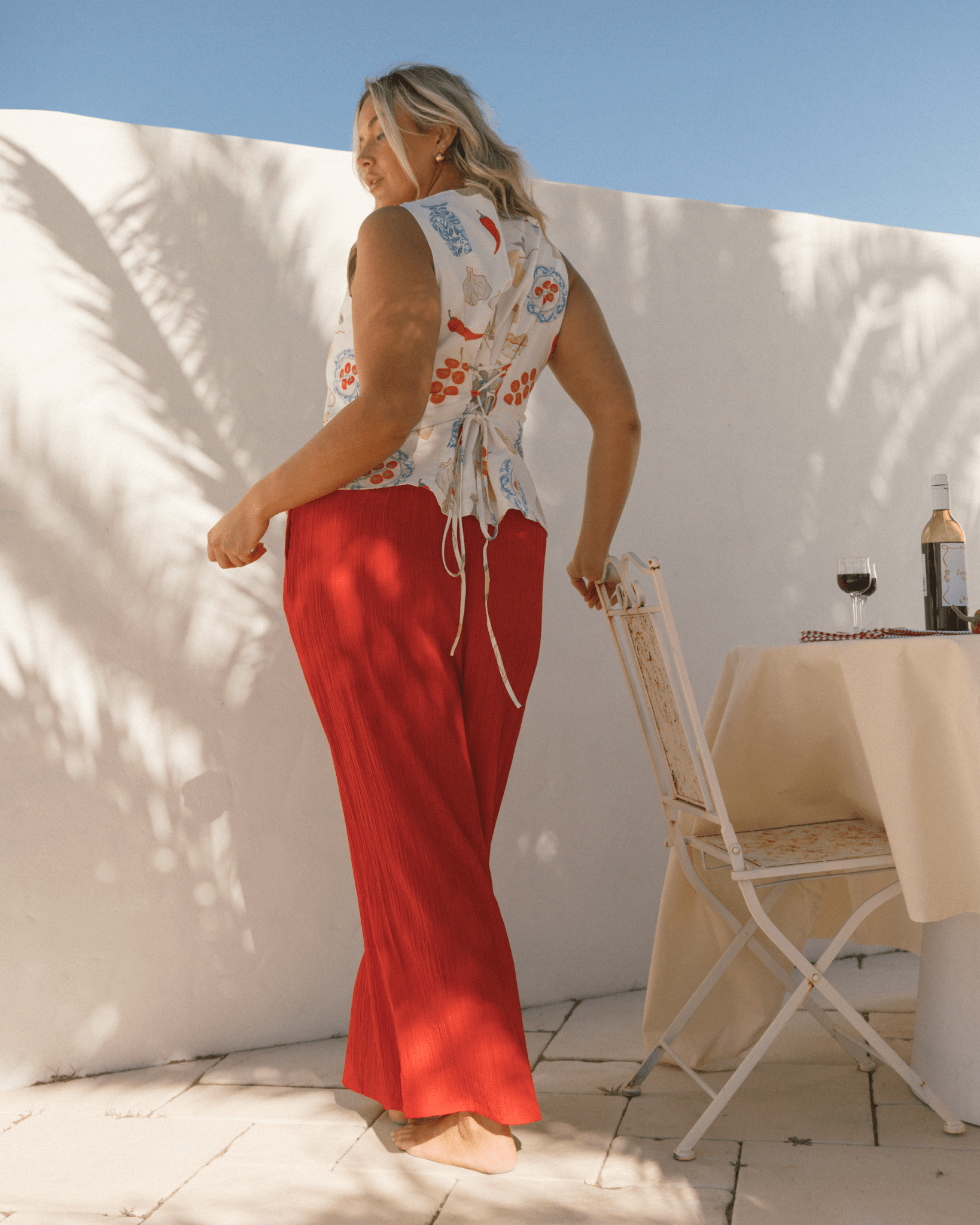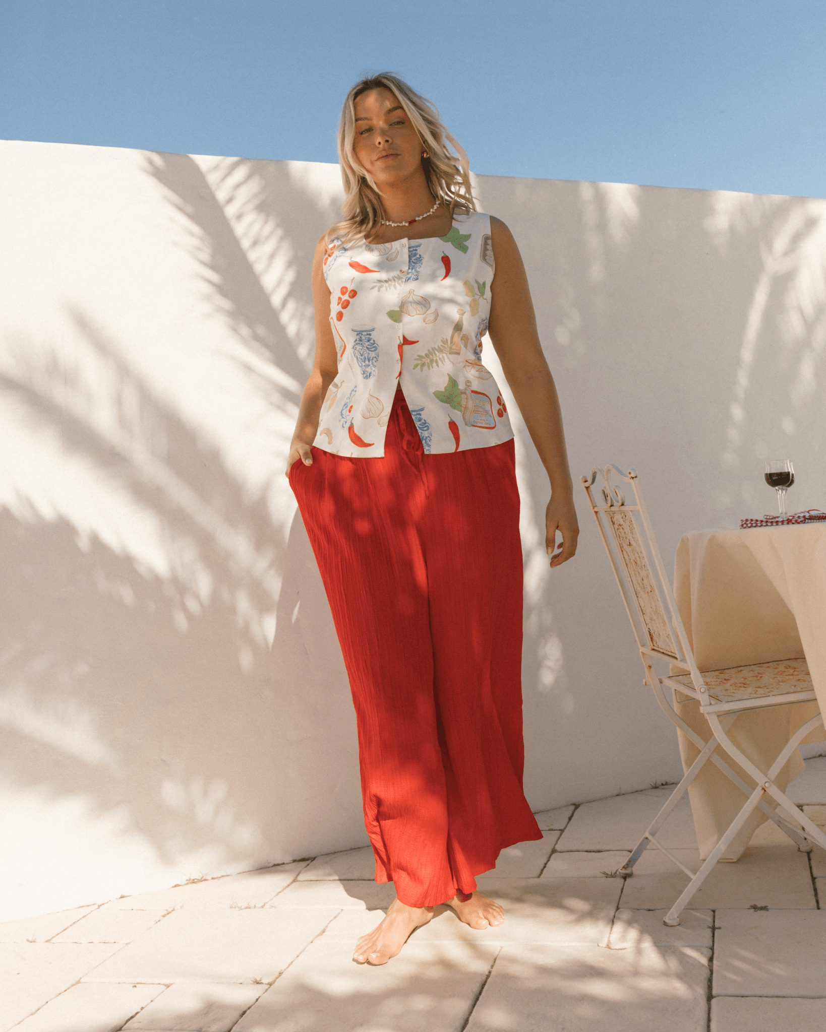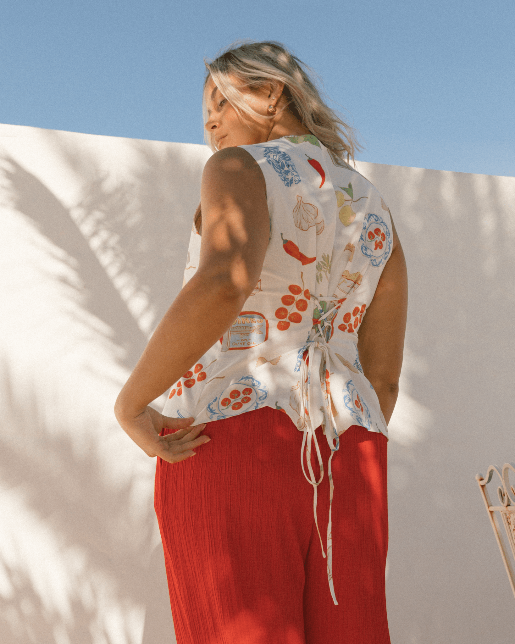 Elevate your wardrobe with the stunning Ella Vest in our exclusive Nonnas Kitchen print! This versatile vest features a chic button-down front and a unique drawstring back detail, allowing you to customise the fit to suit your style. Crafted from 100% cotton, it’s not only soft and breathable but also fully lined for added comfort.
