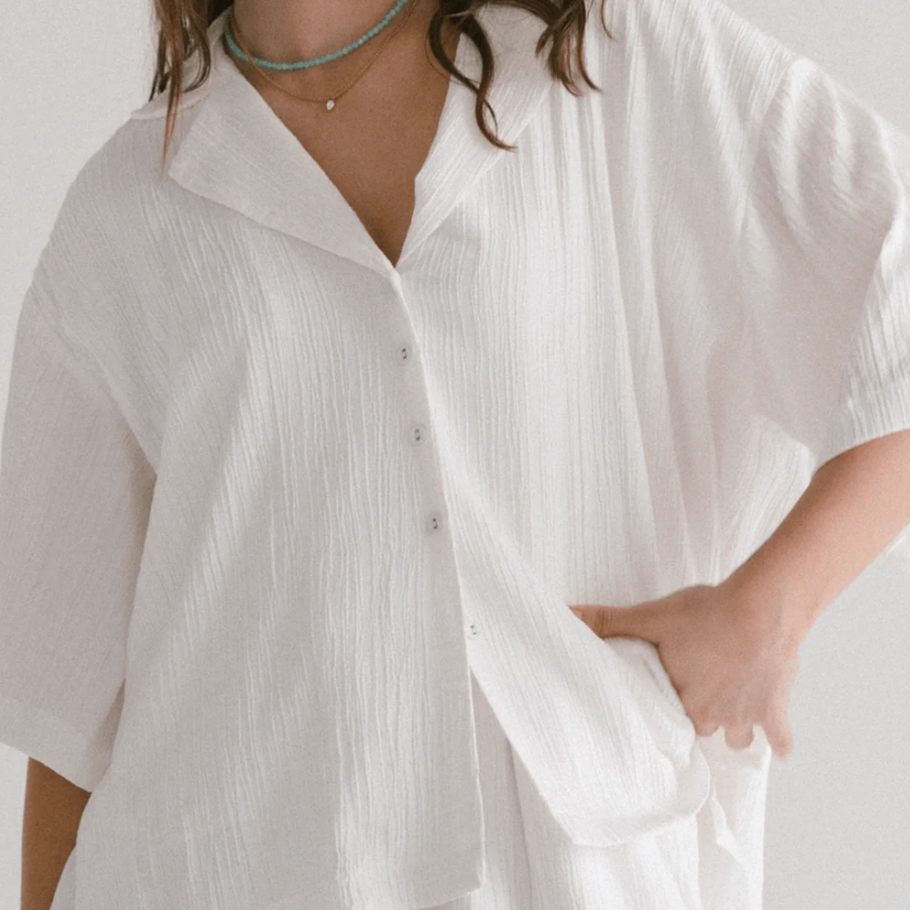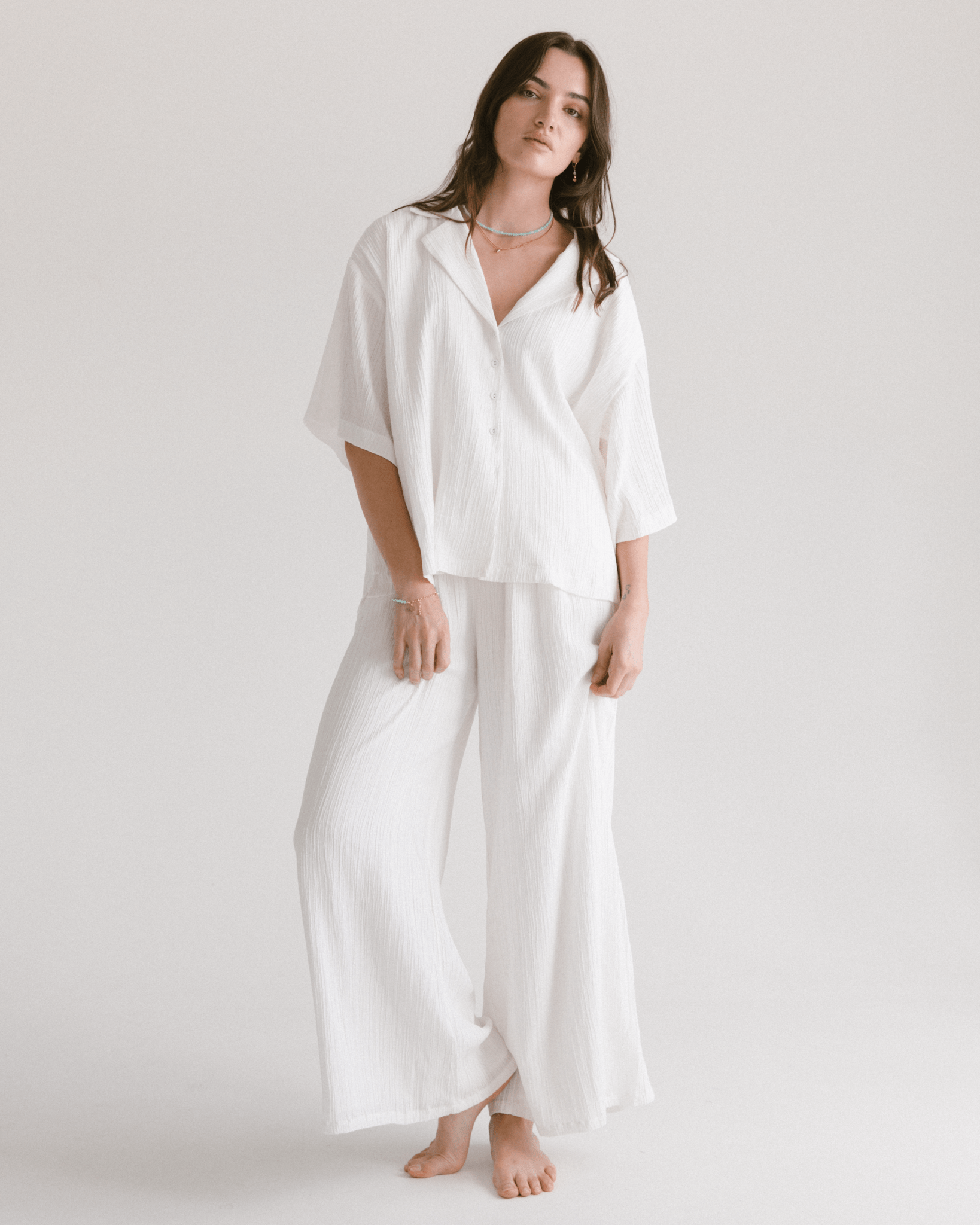 Our Crepe styles are crafted from a beautiful, breathable blend designed for comfort and elegance. Due to the nature of the loose weave, this fabric is more delicate than our cotton and linen pieces and requires extra care to maintain its quality and longevity.