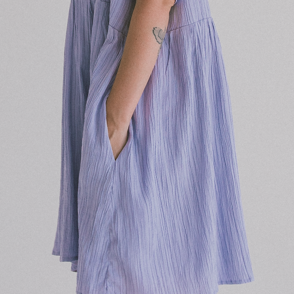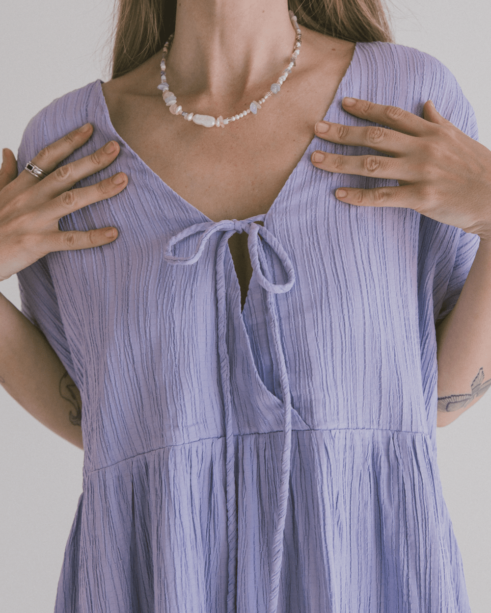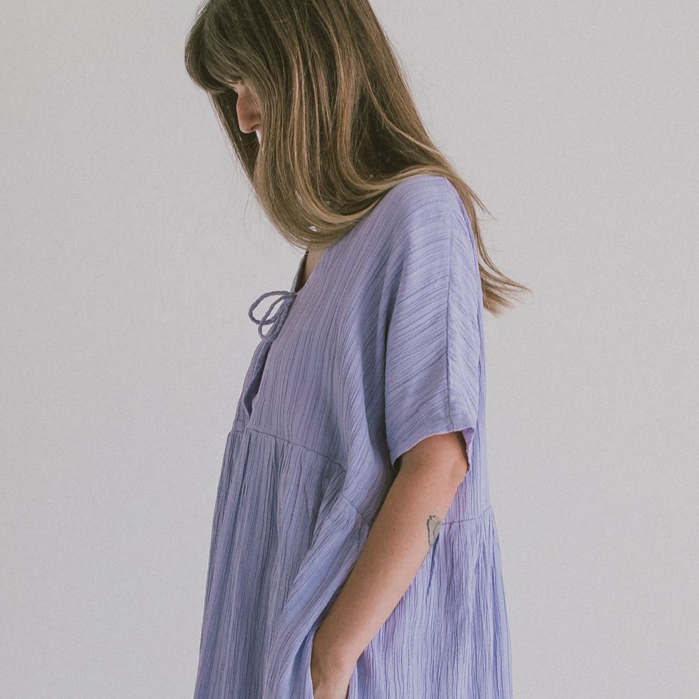 Your Lainey Dress in Purple Crepe is floaty, playful, and made for all your easy, breezy days — here’s how to keep her looking fresh and flowy: