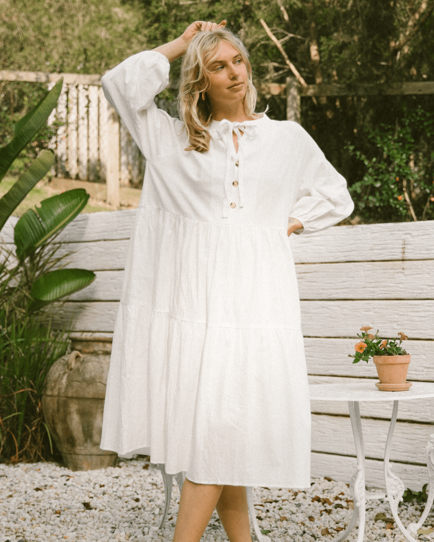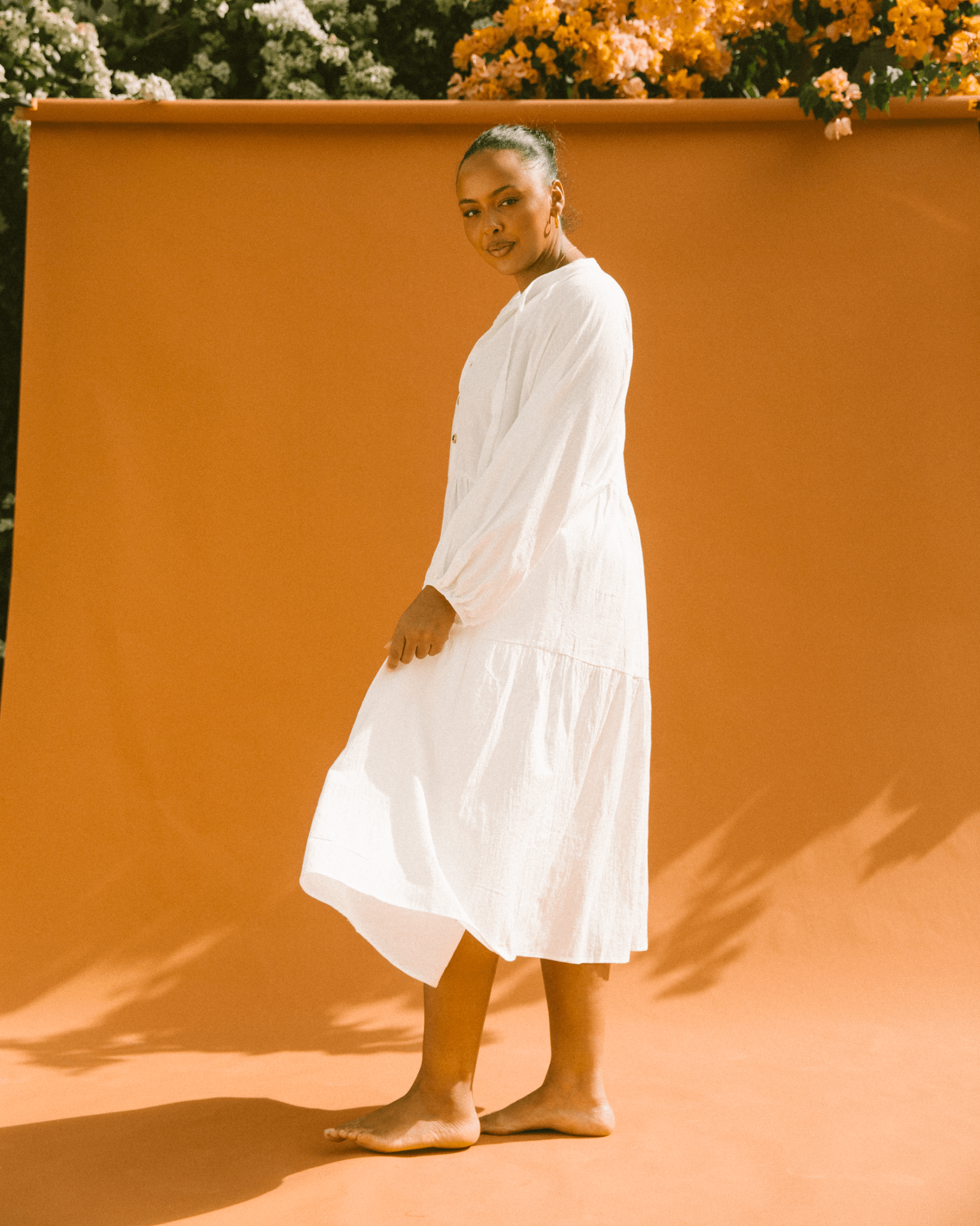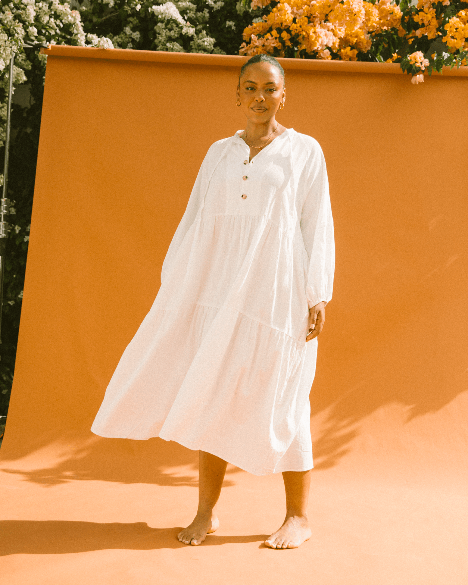 We’re talking billowed sleeves for the drama, functional buttons and pockets for the practicality. And yes — she’s made from 100% cotton, so it’s all breathable, all day.