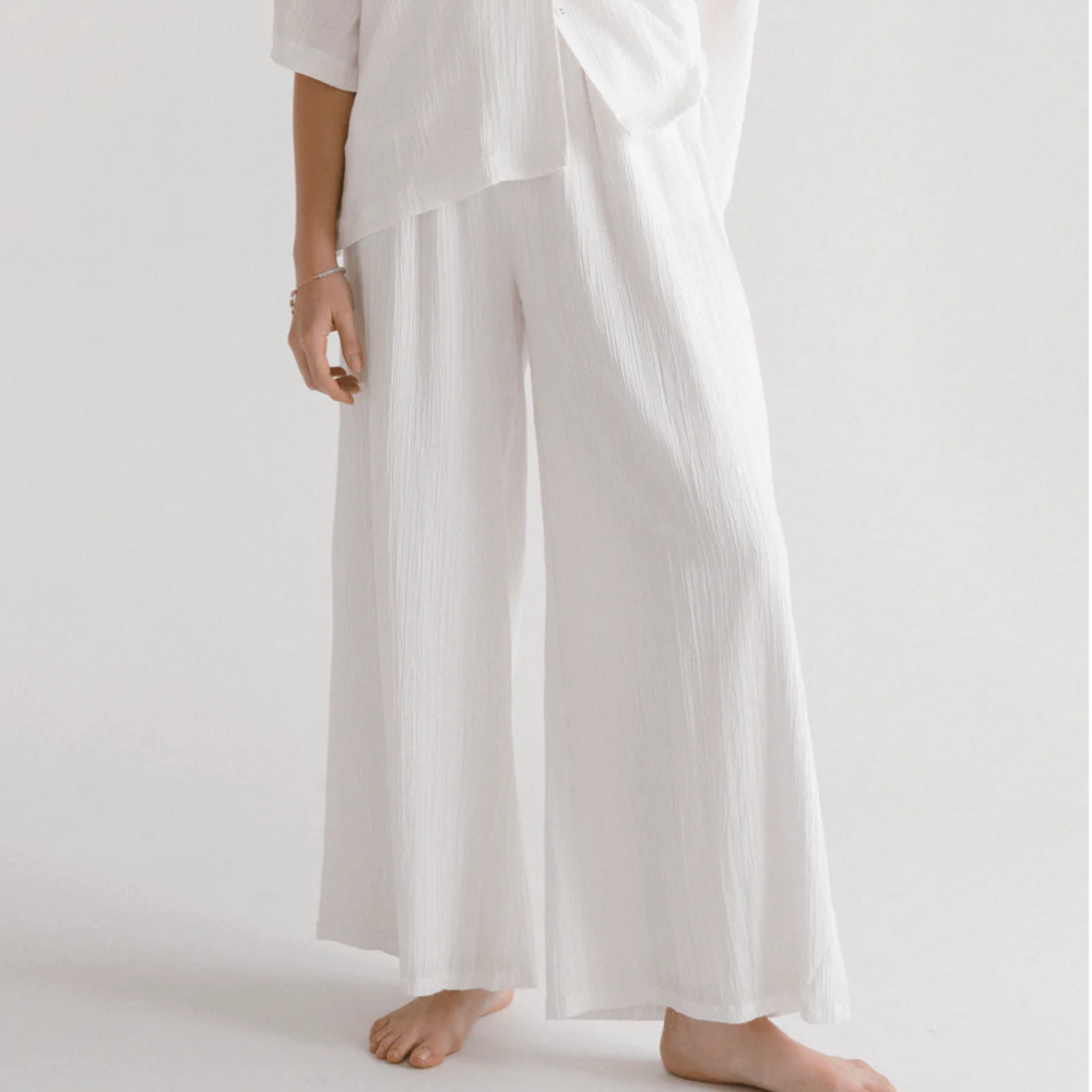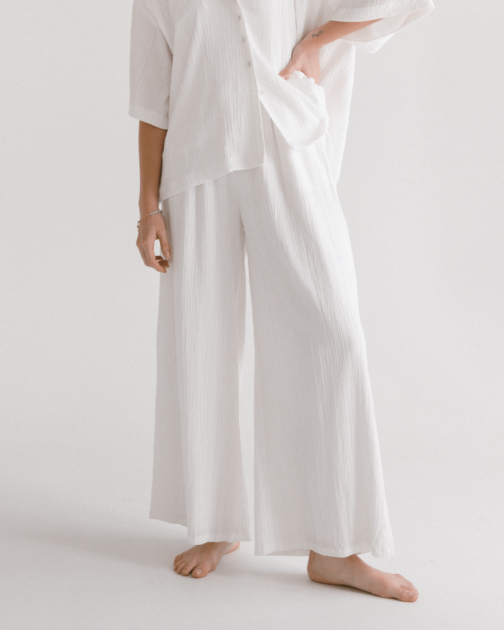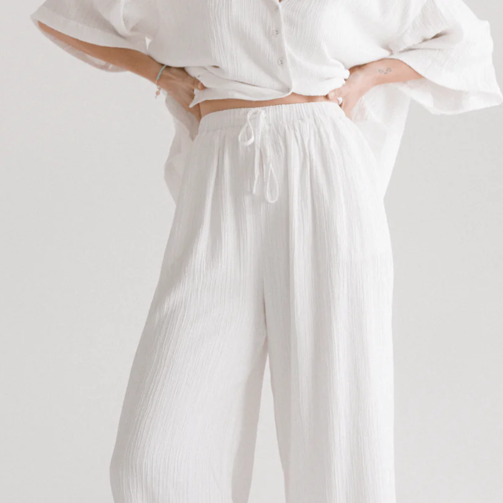 Your White Crepe Posey Pants are floaty, comfy, and basically your new uniform — here’s how to keep them looking fresh and fabulous: