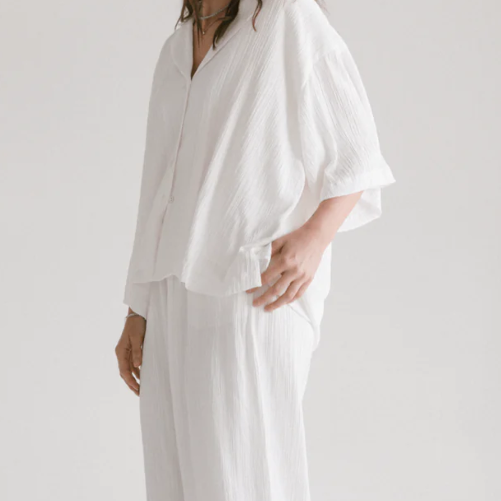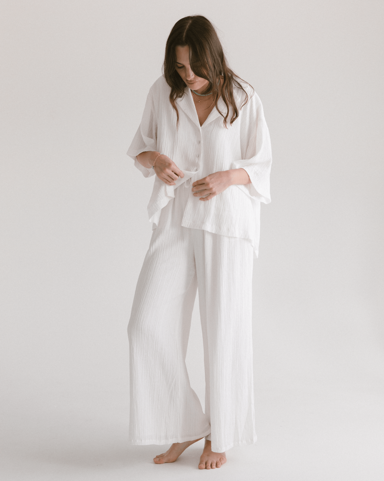 Our Crepe styles are crafted from a beautiful, breathable blend designed for comfort and elegance. Due to the nature of the loose weave, this fabric is more delicate than our cotton and linen pieces and requires extra care to maintain its quality and longevity.