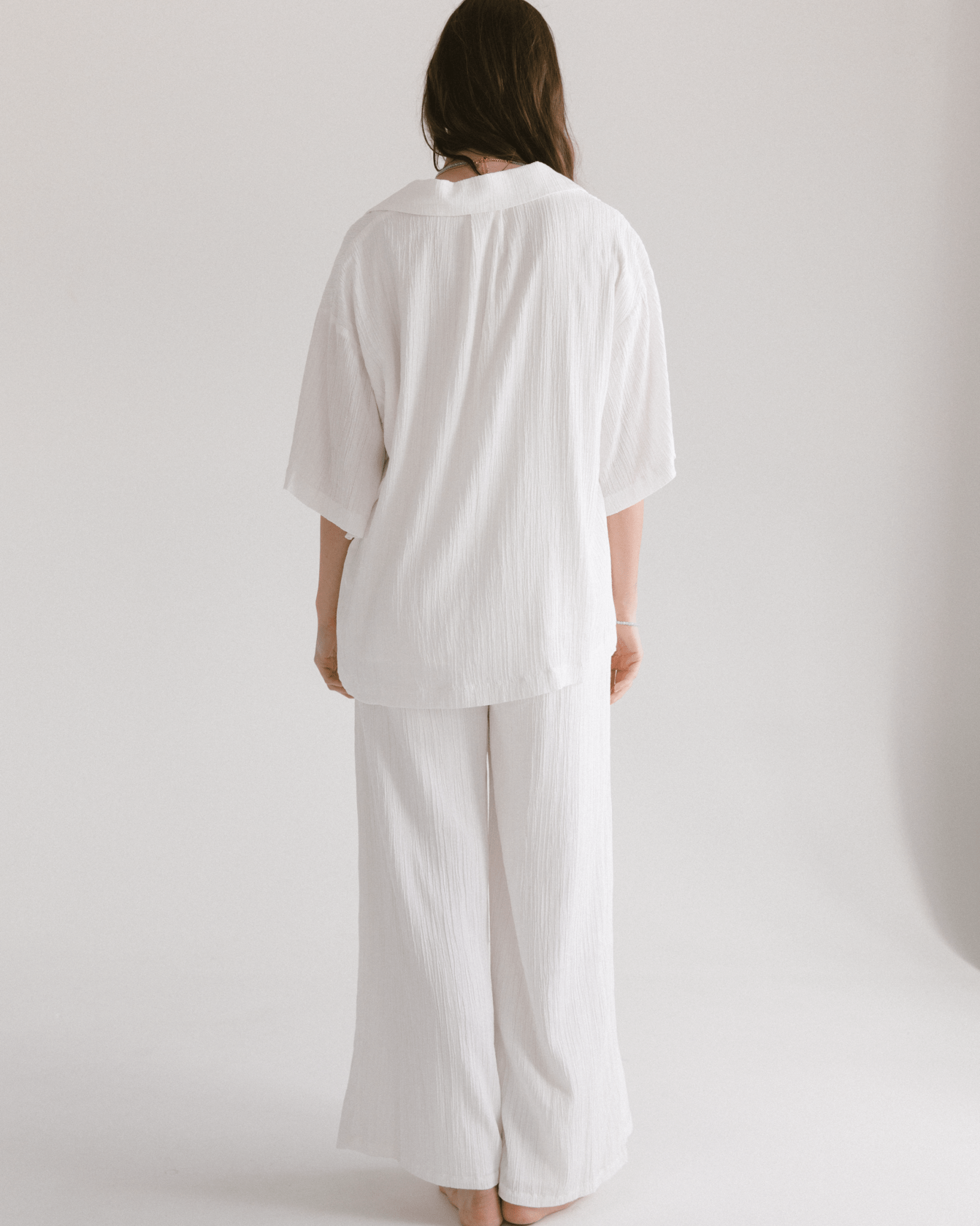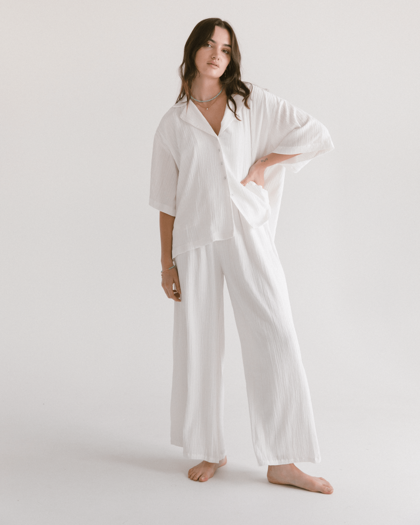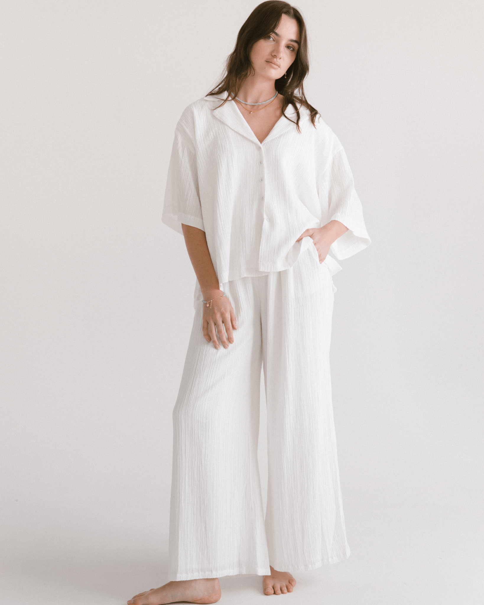Our Crepe styles are crafted from a beautiful, breathable blend designed for comfort and elegance. Due to the nature of the loose weave, this fabric is more delicate than our cotton and linen pieces and requires extra care to maintain its quality and longevity.