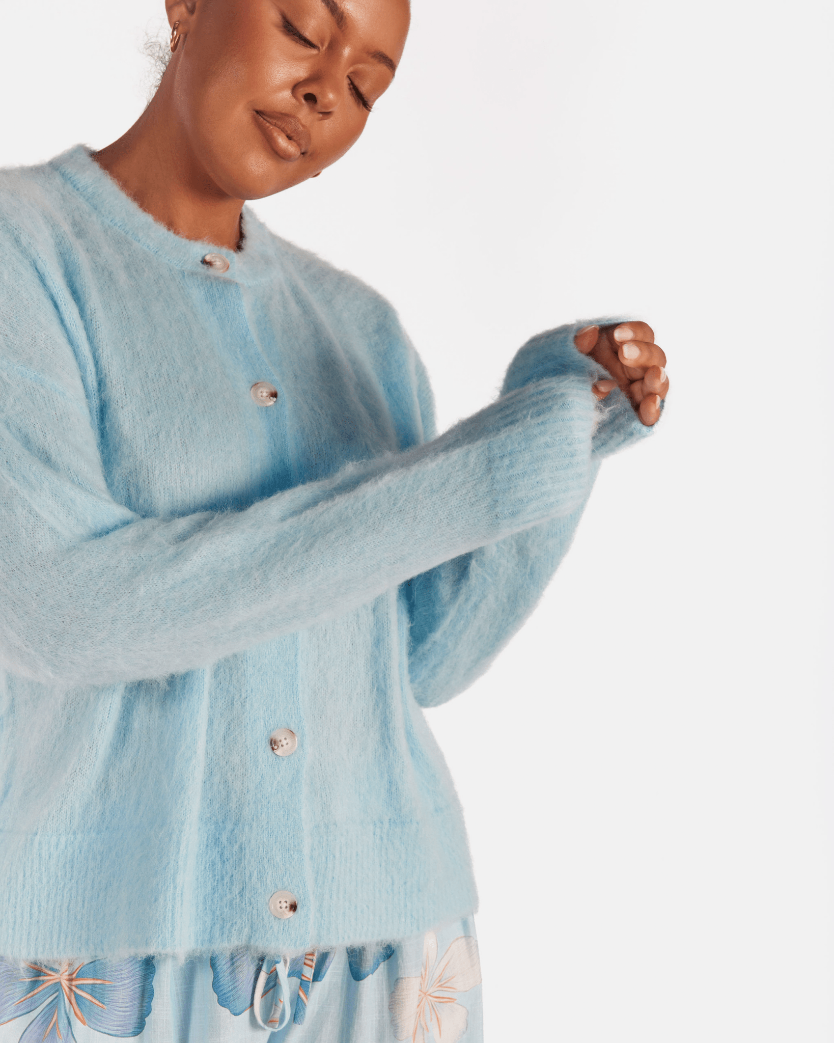 Crafted from a cosy knit blend of 6% Mohair, 45% Nylon, 11% Wool and 38% Acrylic, the Courtney Cardi has a beautiful fluffy texture while still feeling lightweight and breathable. With a GSM of 318, it gives you warmth without heaviness, perfect for layering over dresses, tees or lounge sets.