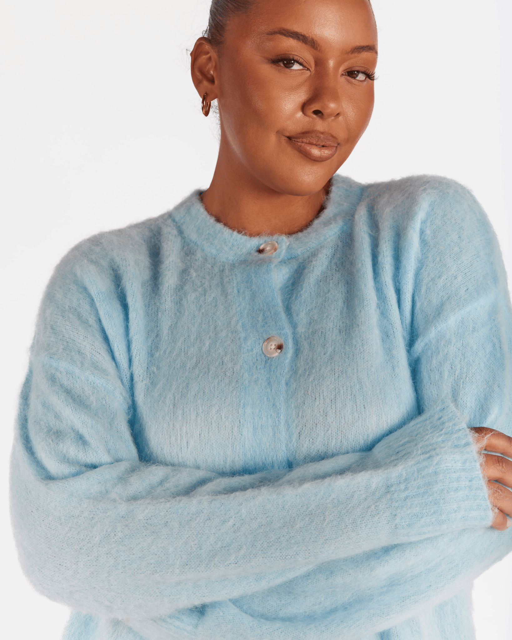 Crafted from a cosy knit blend of 6% Mohair, 45% Nylon, 11% Wool and 38% Acrylic, the Courtney Cardi has a beautiful fluffy texture with a lightweight feel. With a GSM of 318, it offers warmth without bulk, making it perfect for layering over your everyday outfits.
