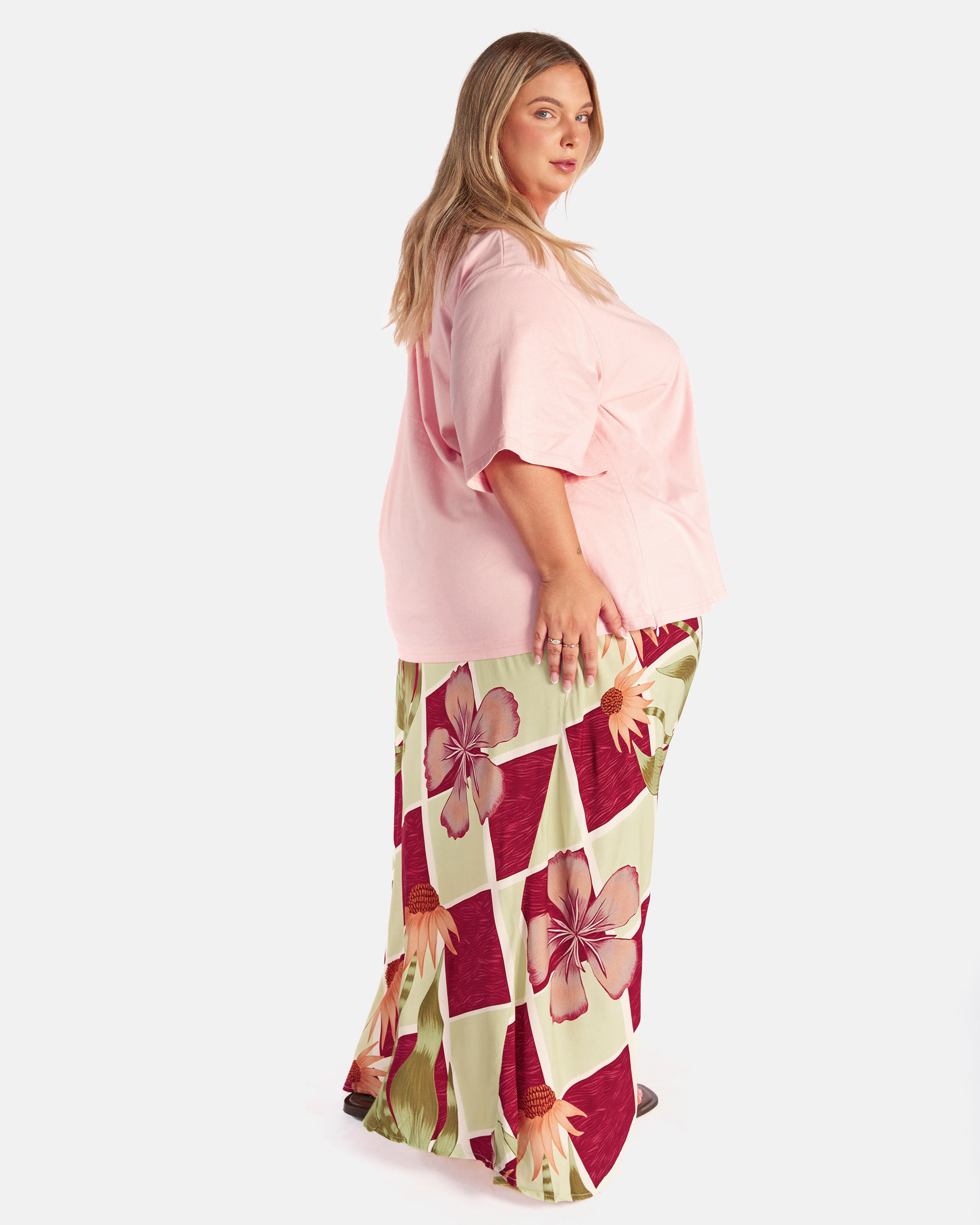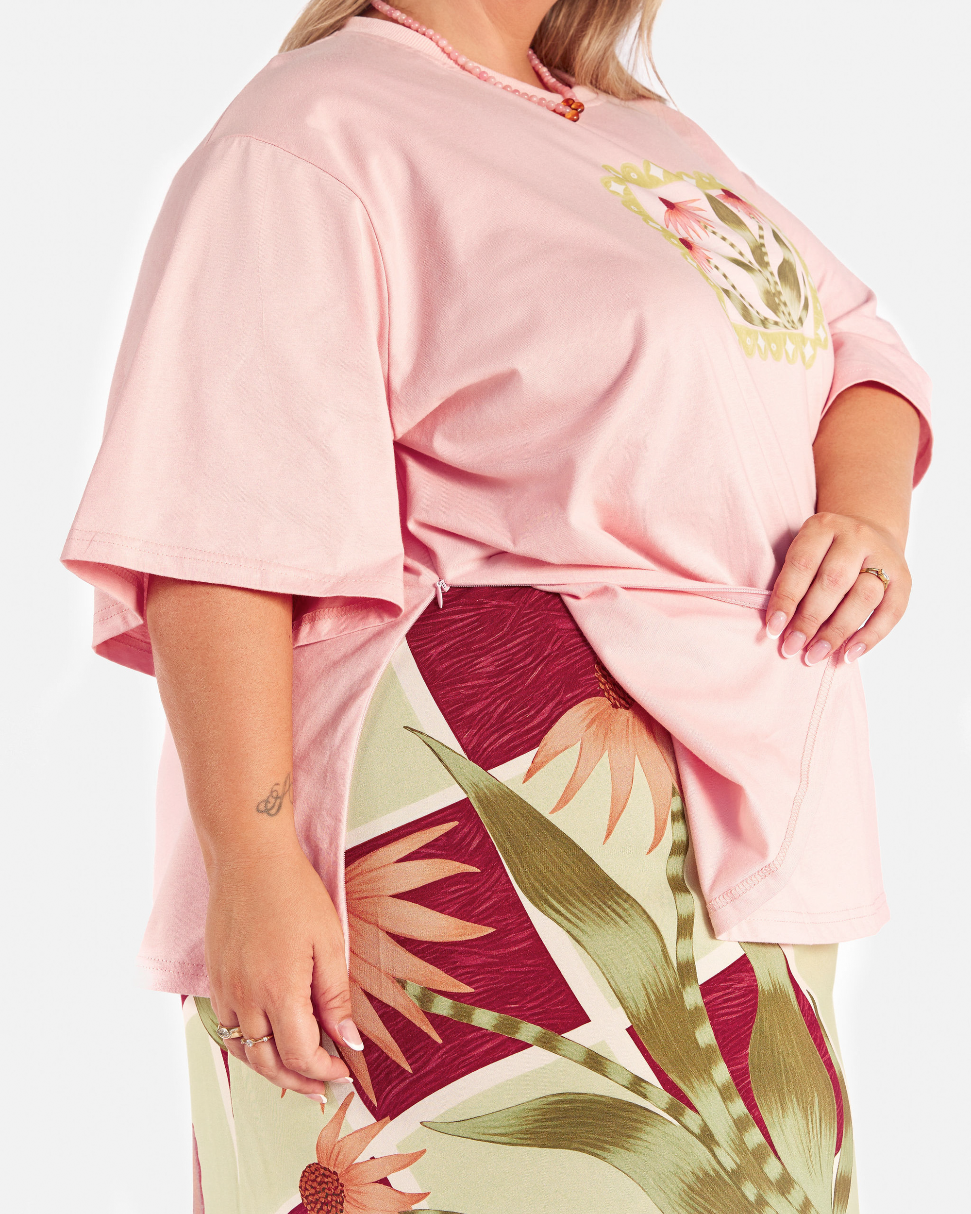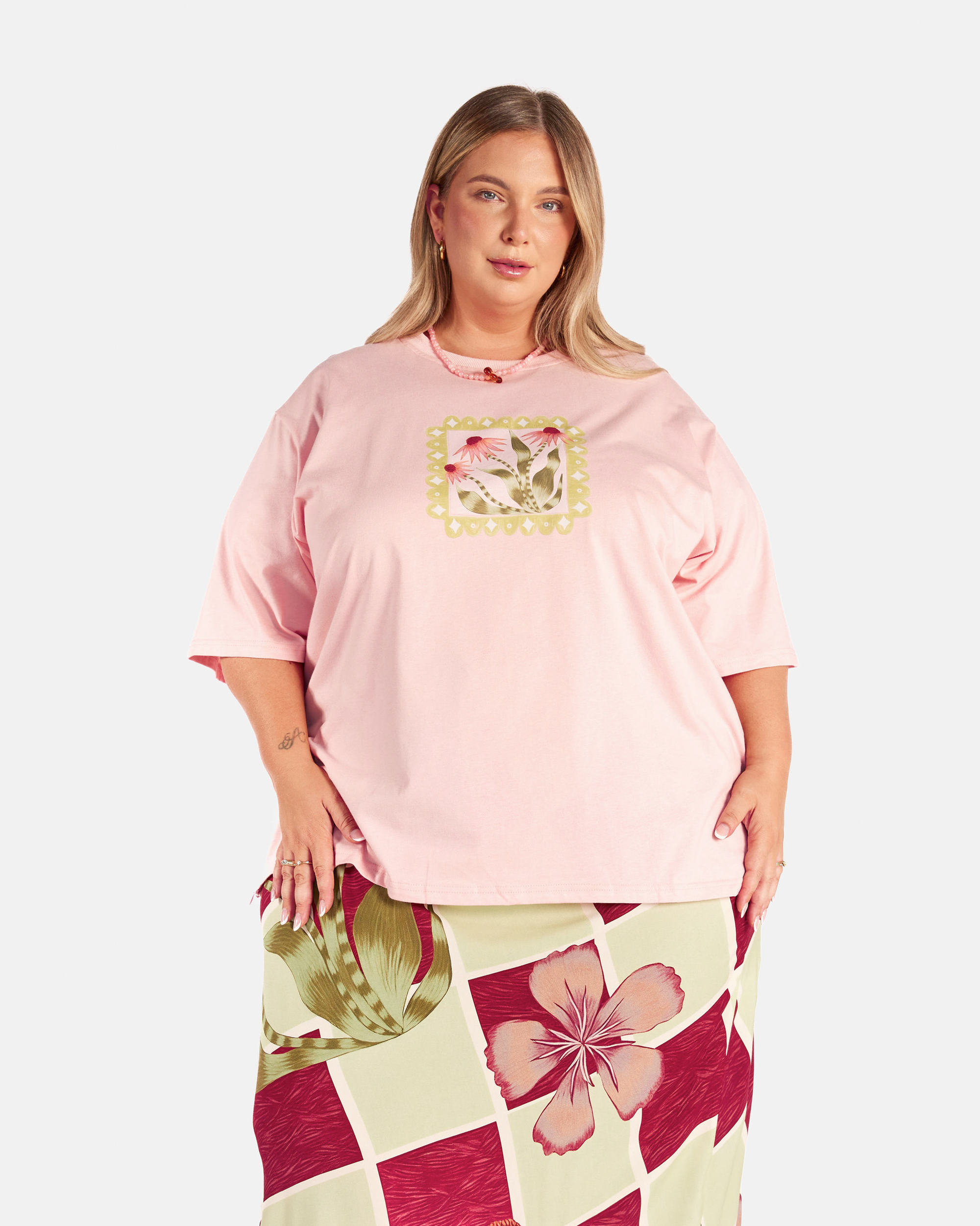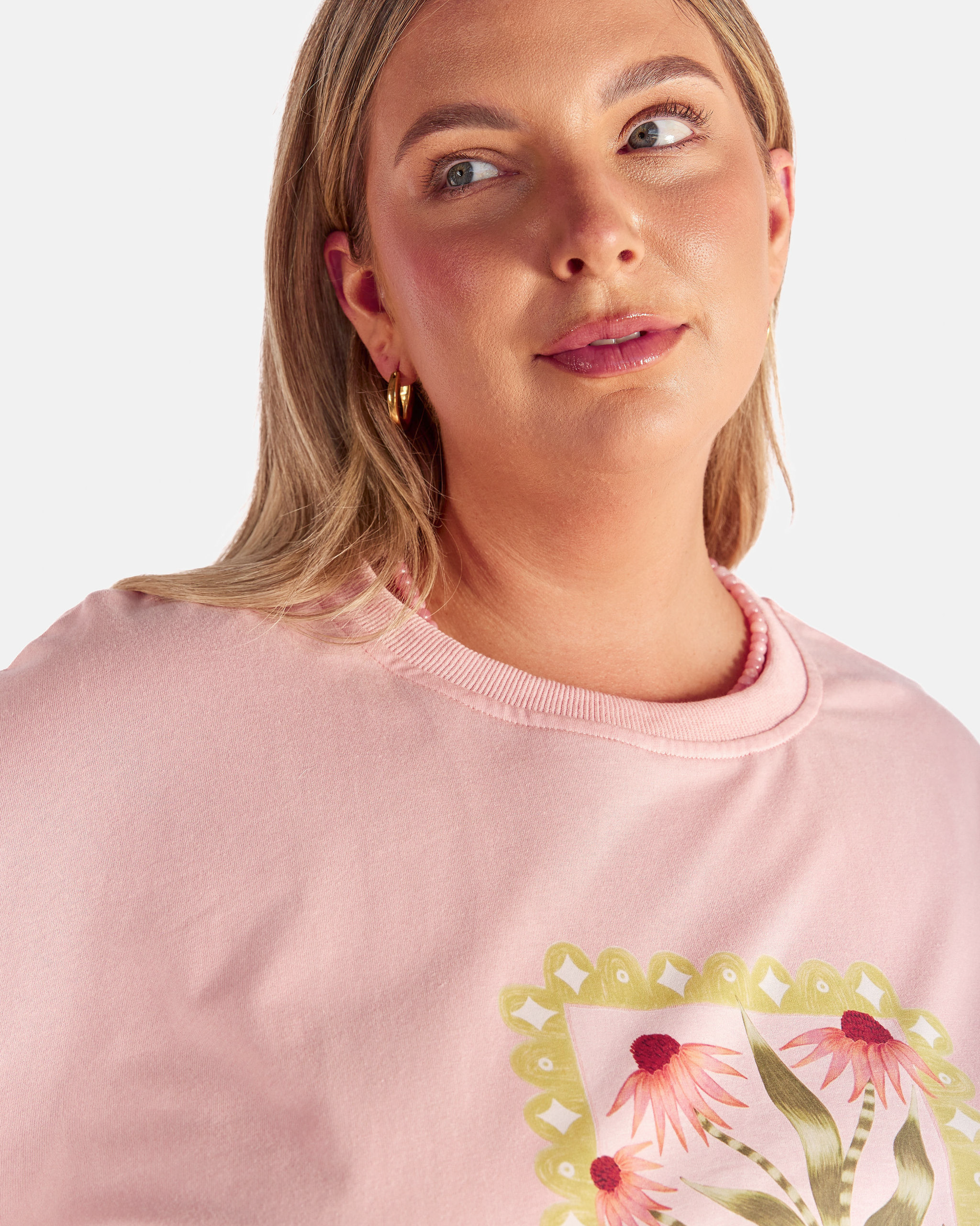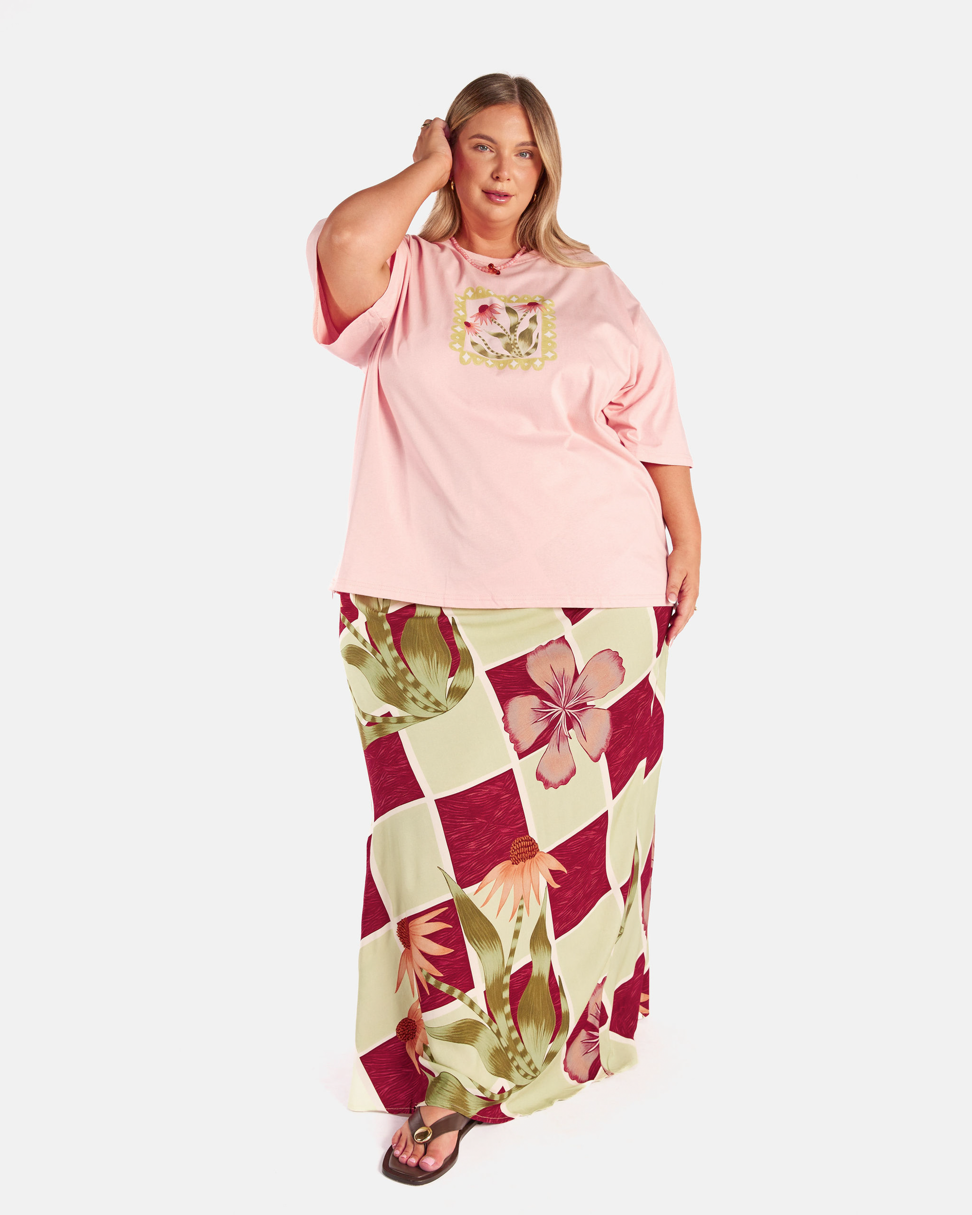 The Wildframe print is a hand drawn placement design by Art by Saint. Set on a soft, warm pink base, the print features illustrated florals in muted red and dusty rose tones with deep green leaves. The design is framed with an olive green scalloped border and subtle white detailing, giving it a vintage inspired, art led feel that still works effortlessly for everyday wear.