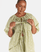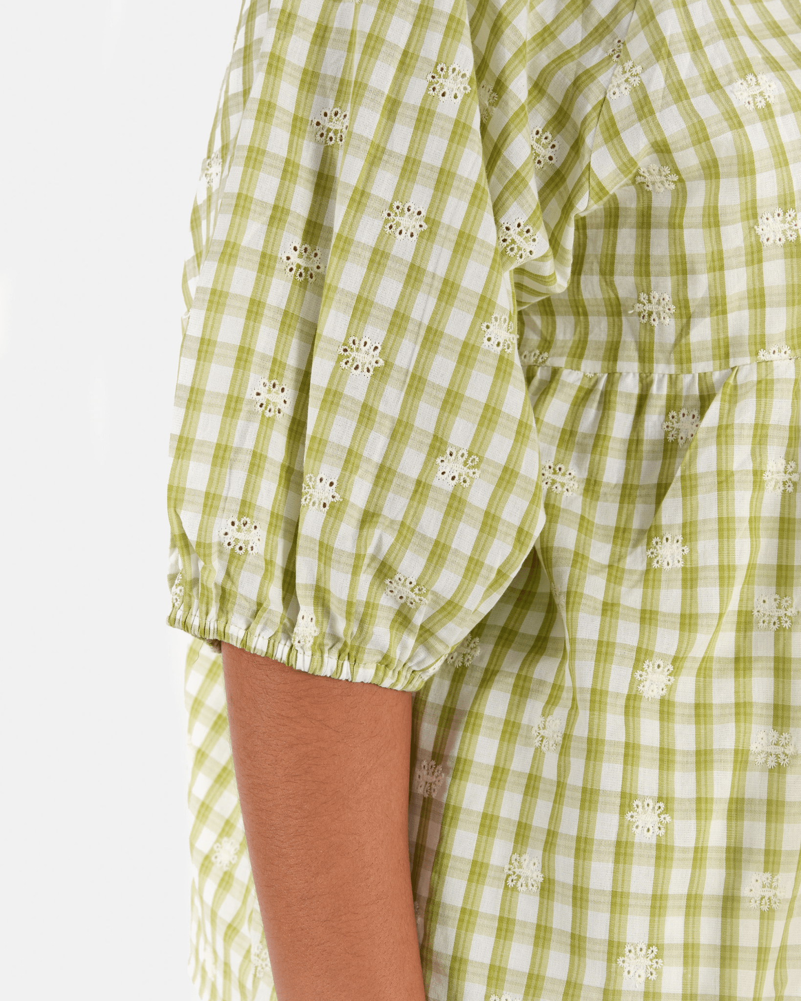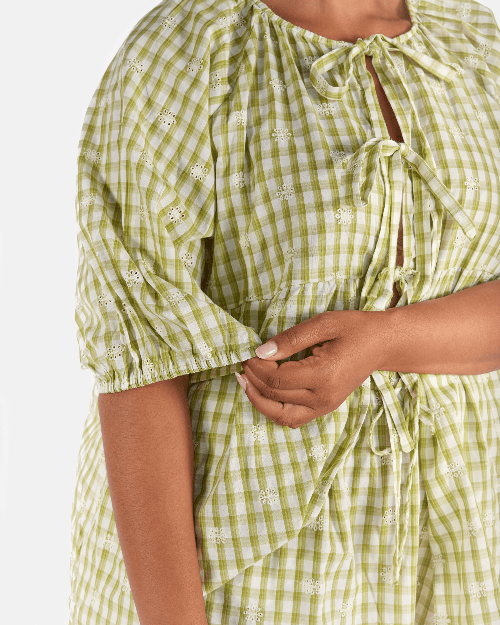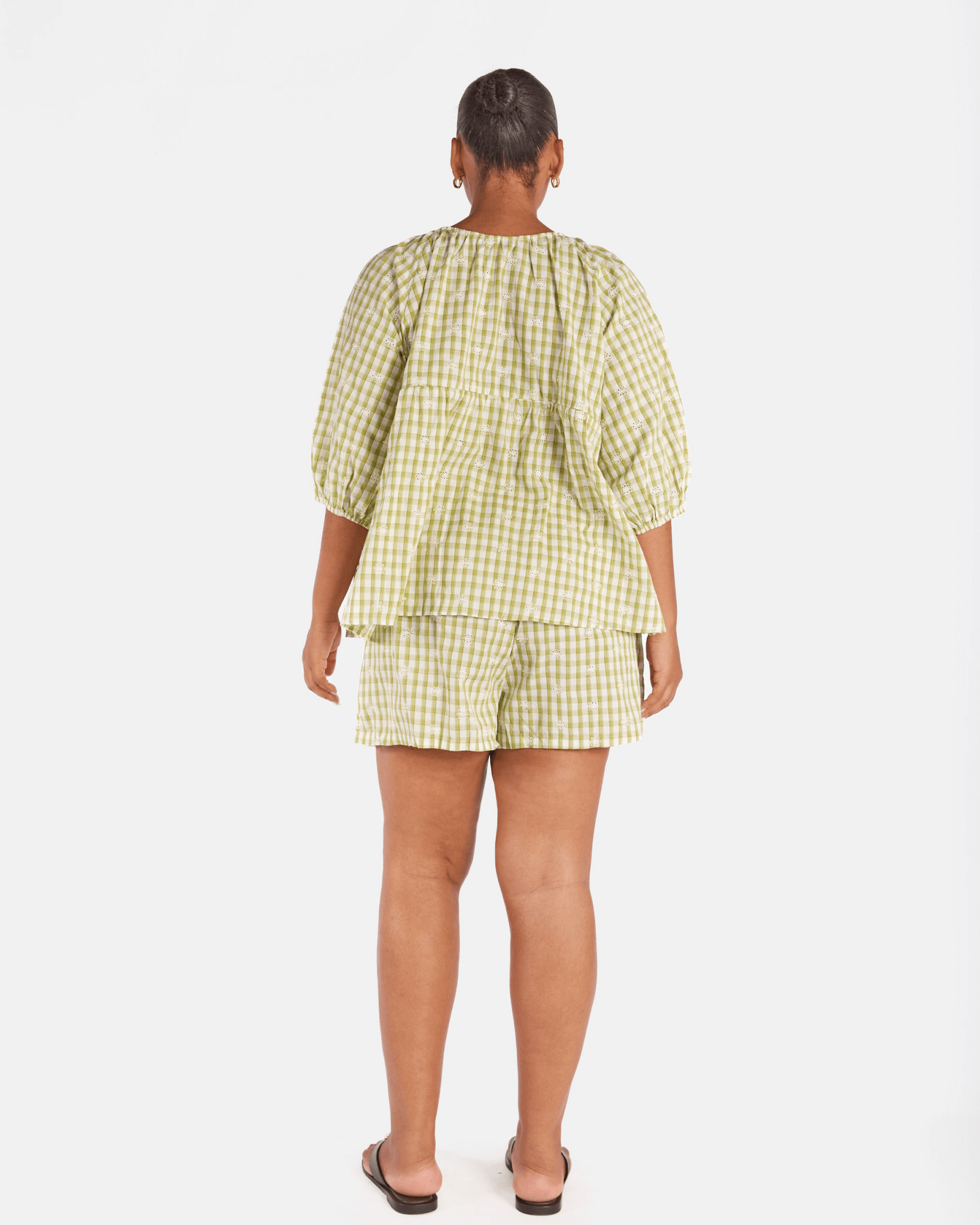 The Florence Top in Pear Gingham Embroidery is playful, practical, and made for real life. Crafted from 100% breathable cotton with delicate embroidered detailing, this green gingham beauty feels light, airy, and effortless to wear.