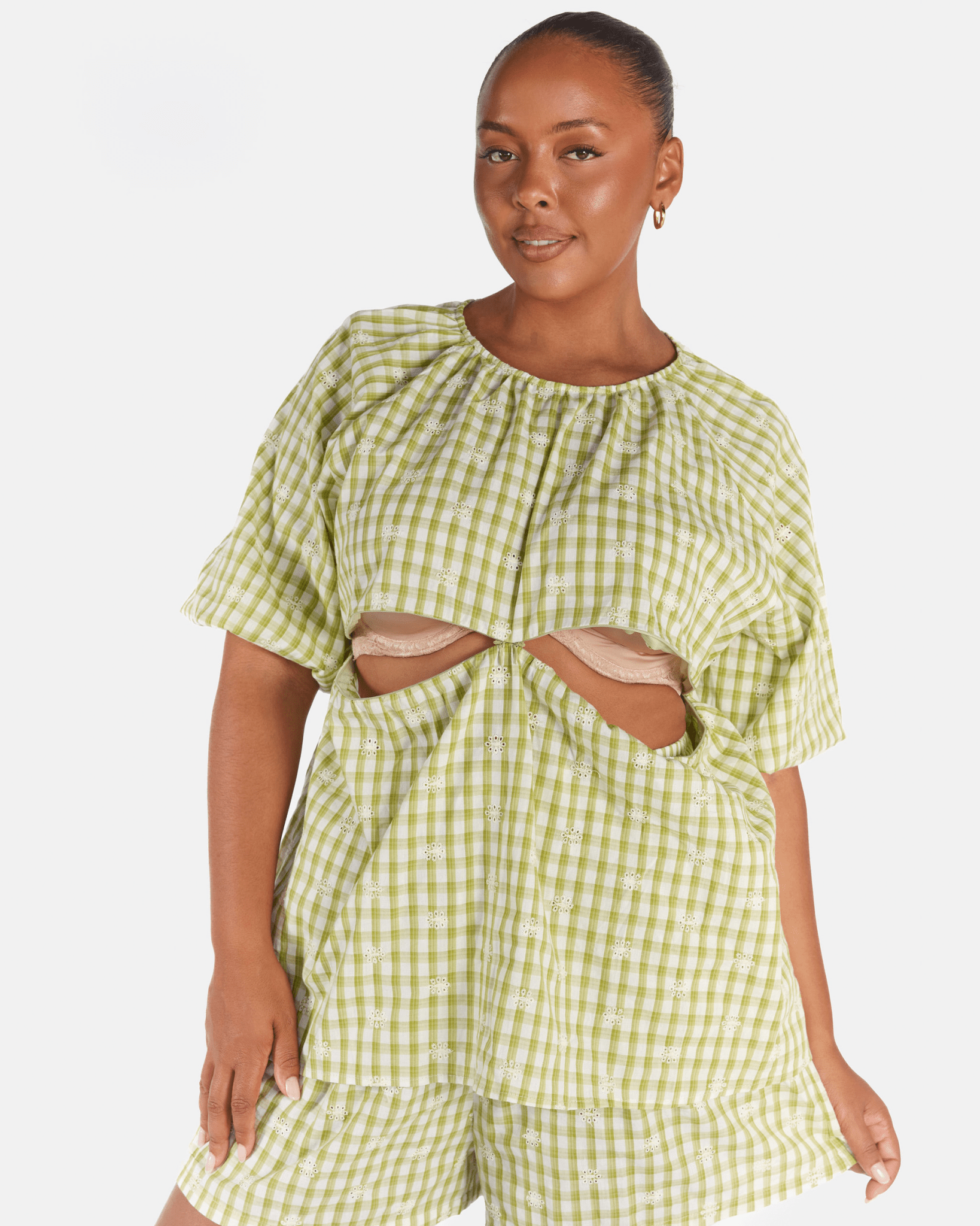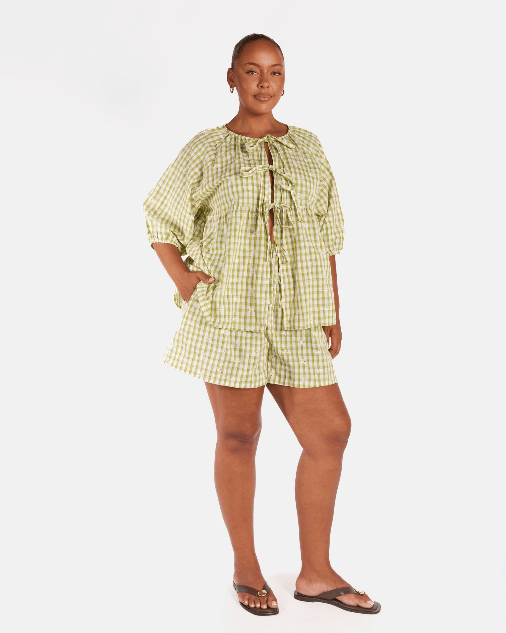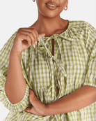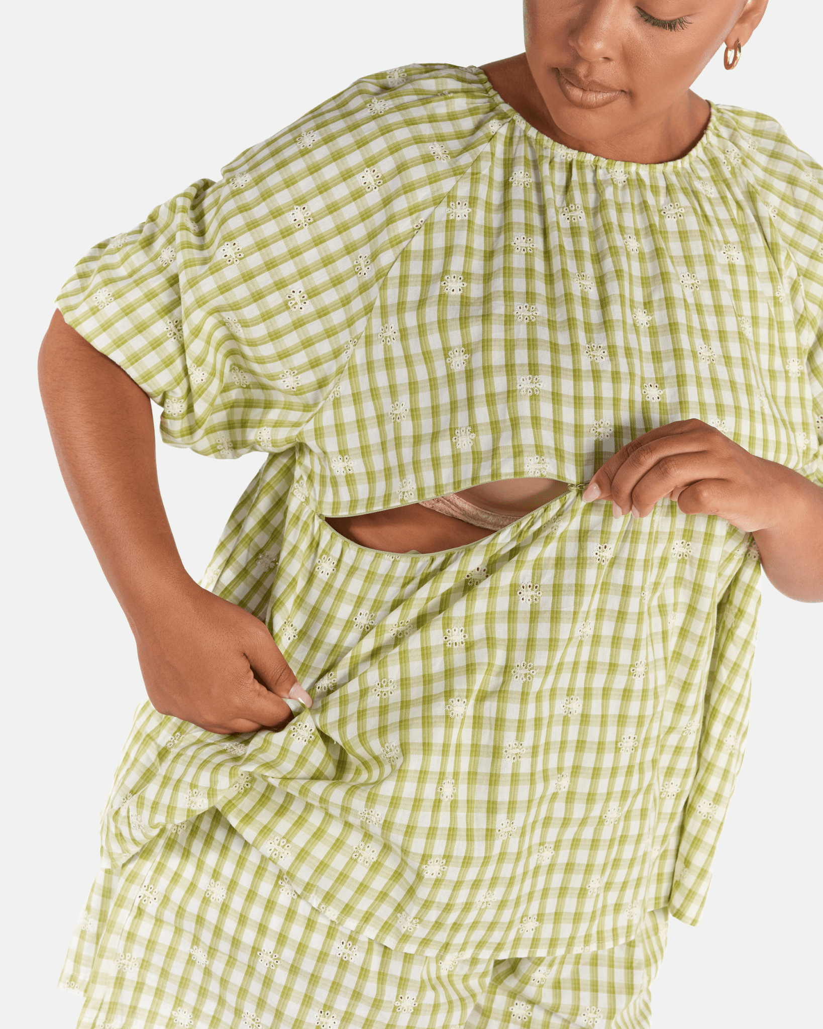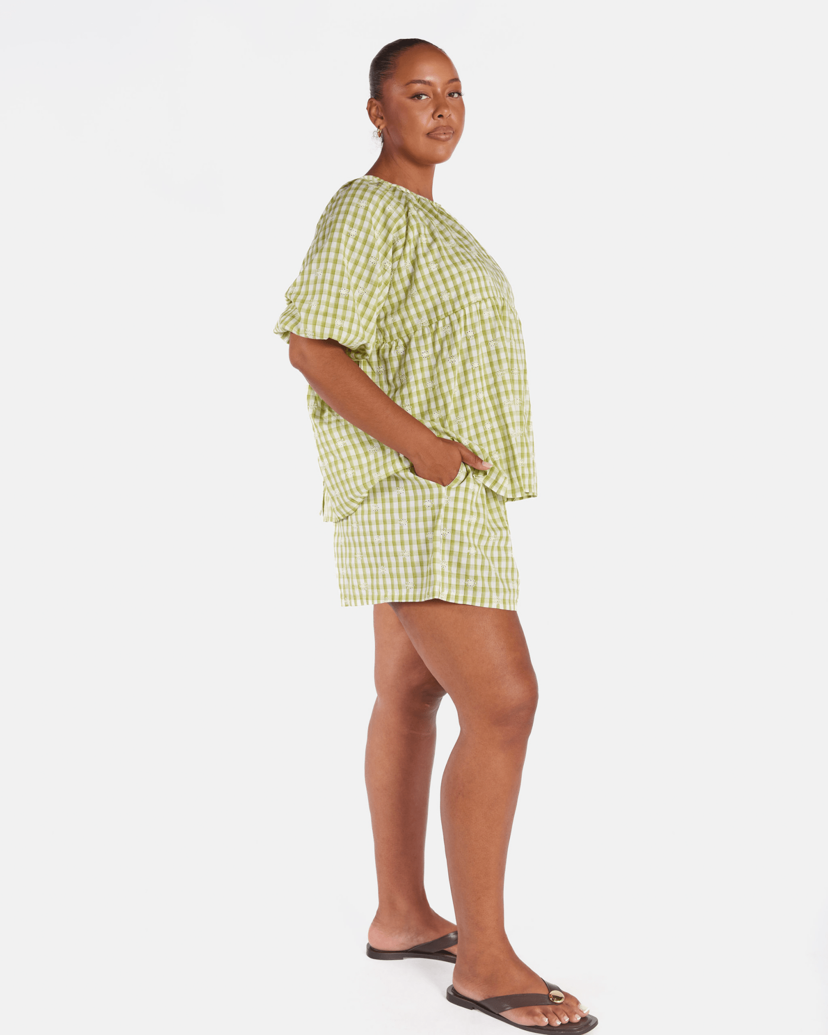 The Florence Top in Pear Gingham Embroidery is playful, practical, and made for real life. Crafted from 100% breathable cotton with delicate embroidered detailing, this green gingham beauty feels light, airy, and effortless to wear.