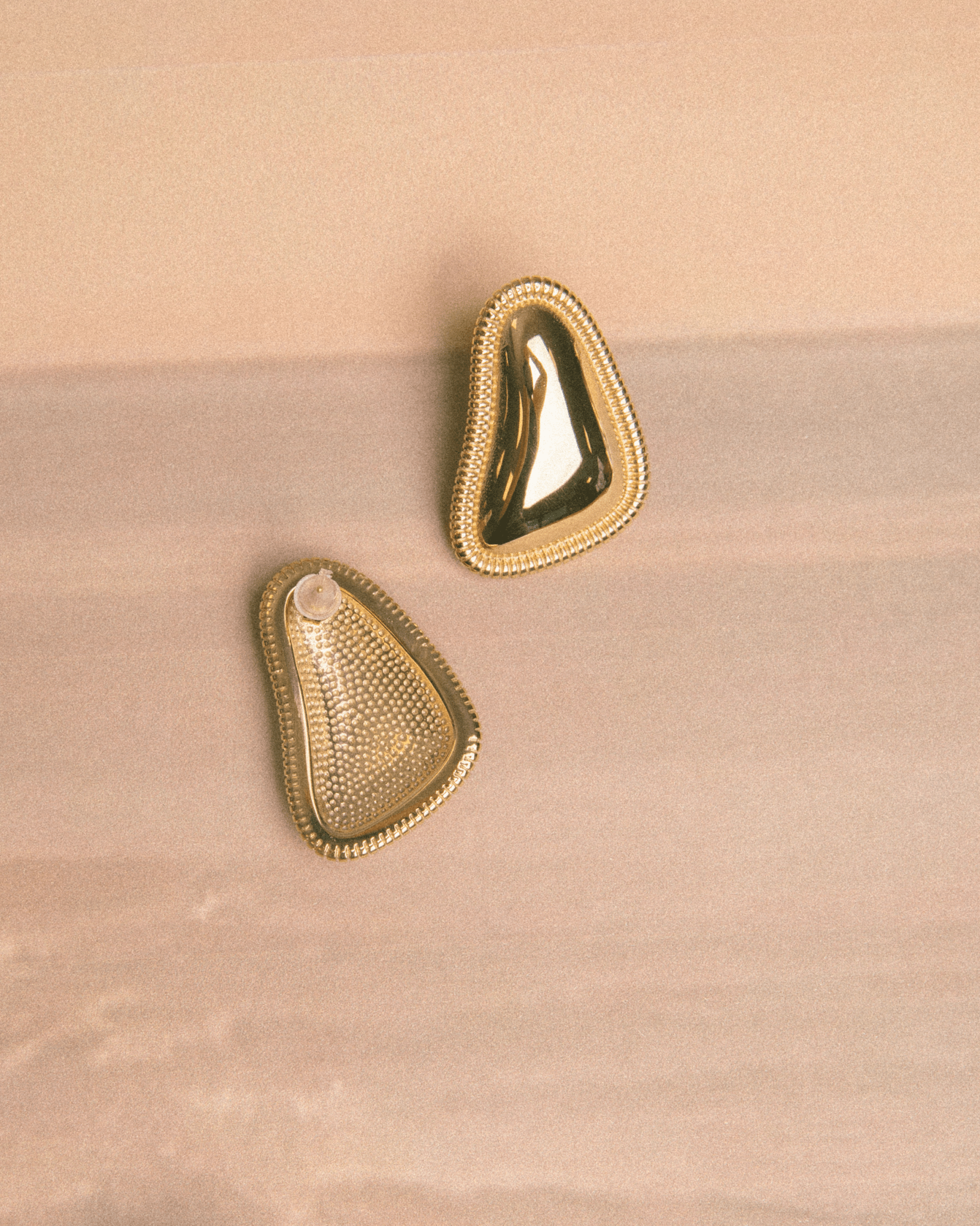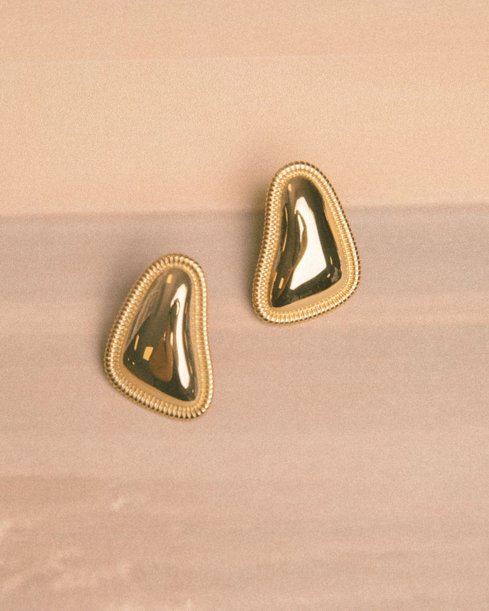 Meet the Golden Ripple Earrings, a bold and chic addition to your accessory collection. Crafted from premium stainless steel and finished with a radiant 18K gold plating, these earrings combine striking design with timeless shine. The unique, organic shape is framed by a rippled border, giving them an effortless statement-making appeal.