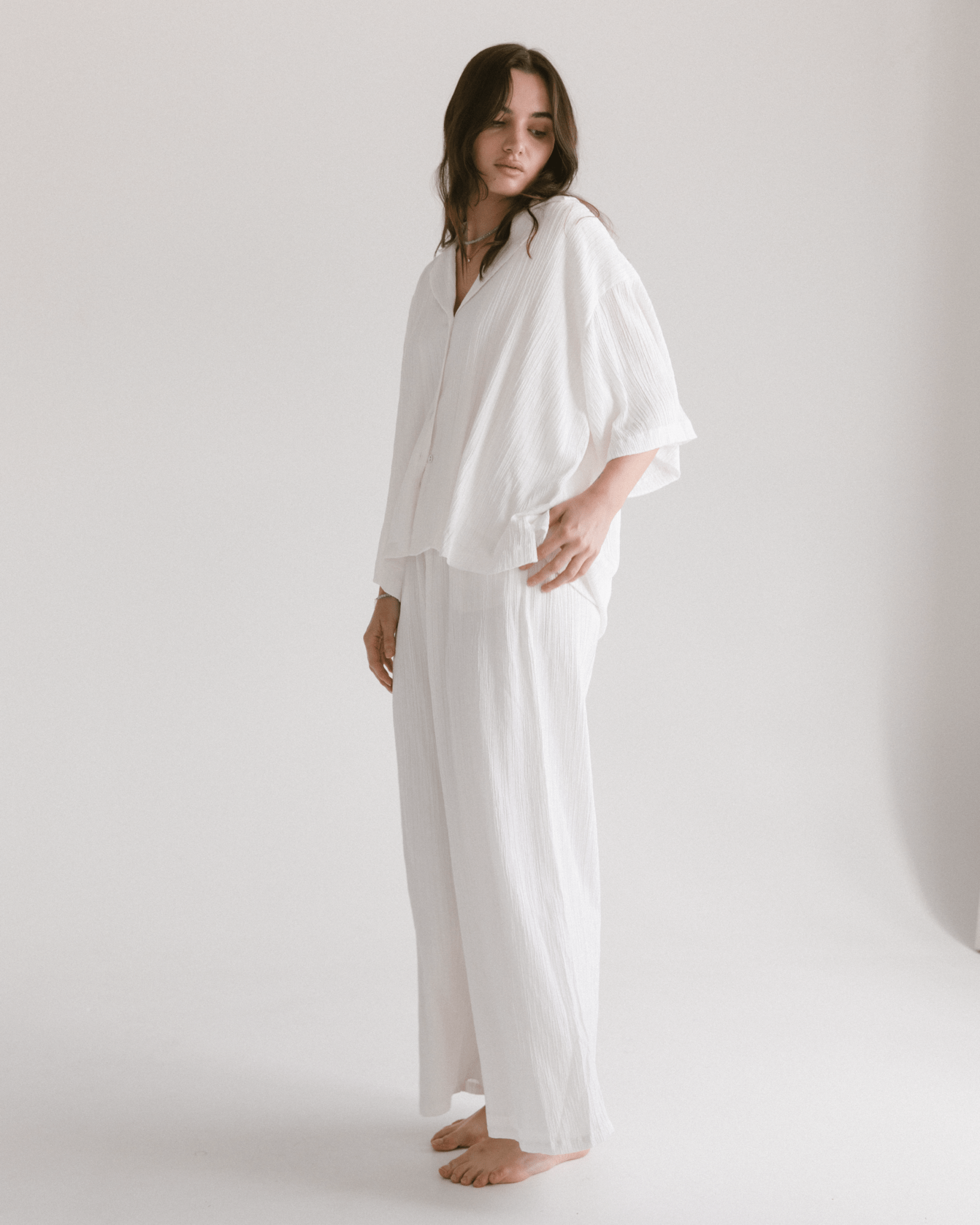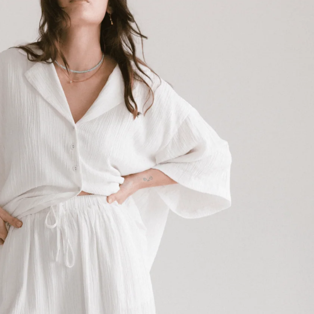 Our Crepe styles are crafted from a beautiful, breathable blend designed for comfort and elegance. Due to the nature of the loose weave, this fabric is more delicate than our cotton and linen pieces and requires extra care to maintain its quality and longevity.