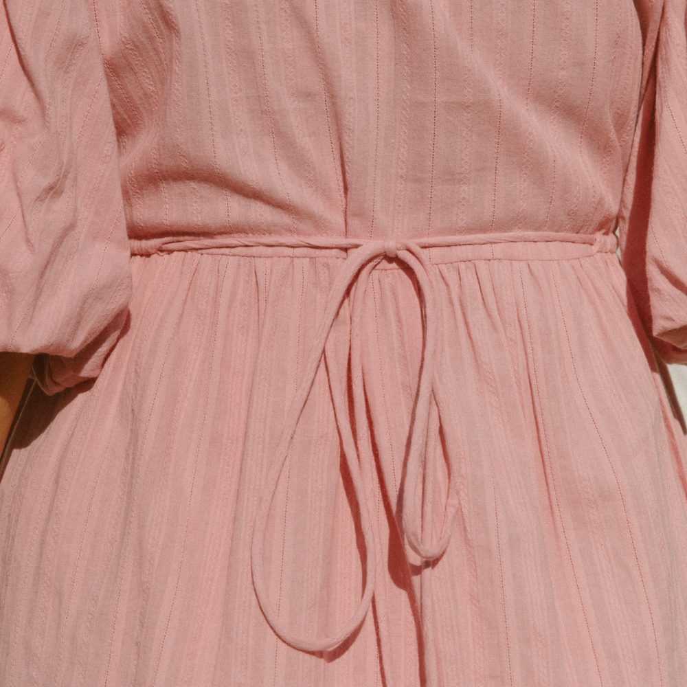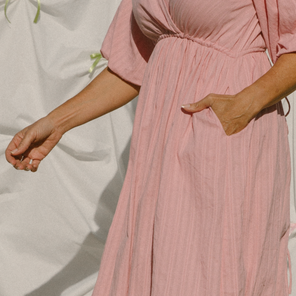 She’s got a cross-over bust for easy breastfeeding, a drawstring waist so you can wear her loose or cinched, and pockets (because life’s too short for dresses without them). Crafted from 100% cotton in our dreamy Pink Breeze hue, she’s light, breathable, and ready for anything from morning markets to afternoon naps.