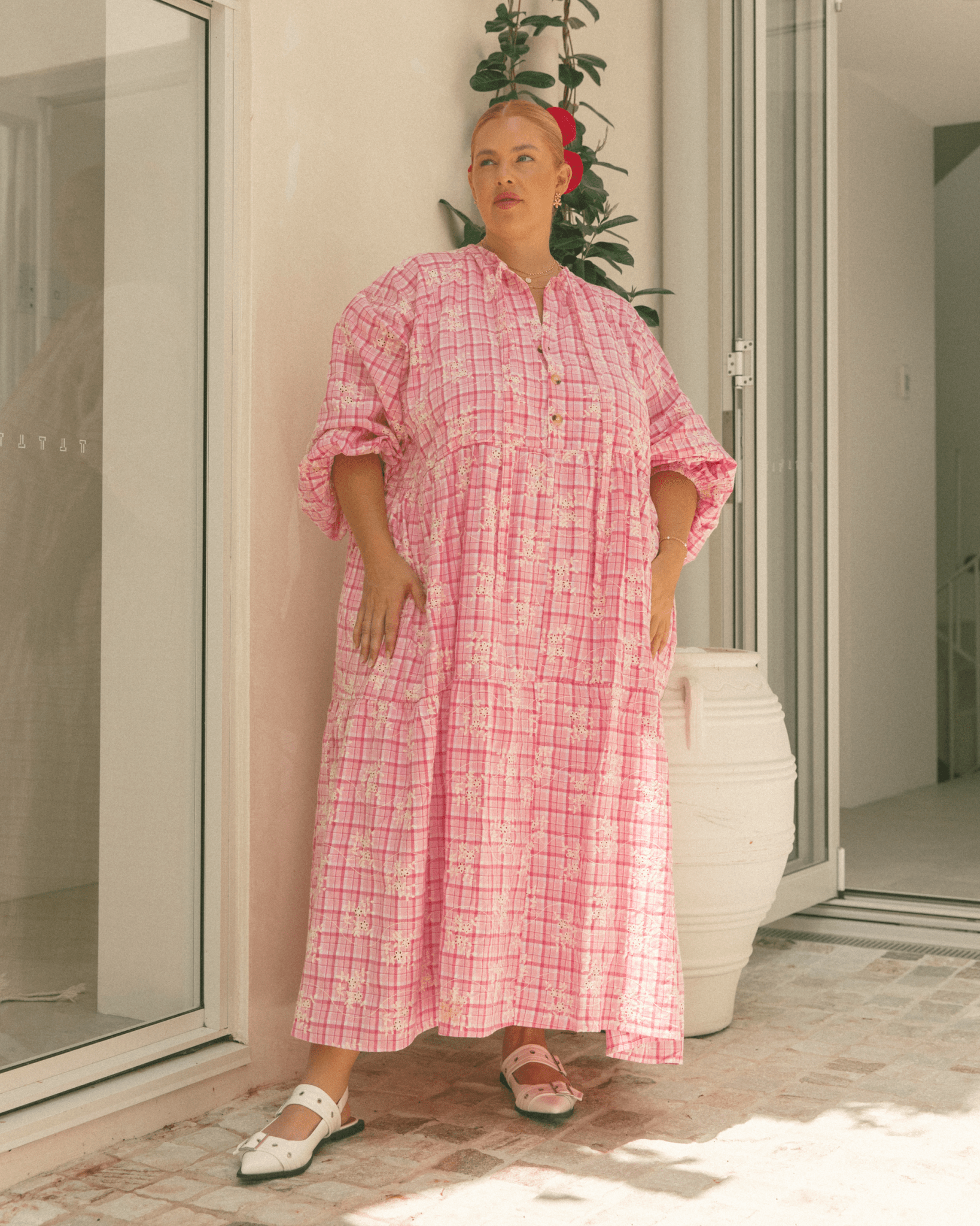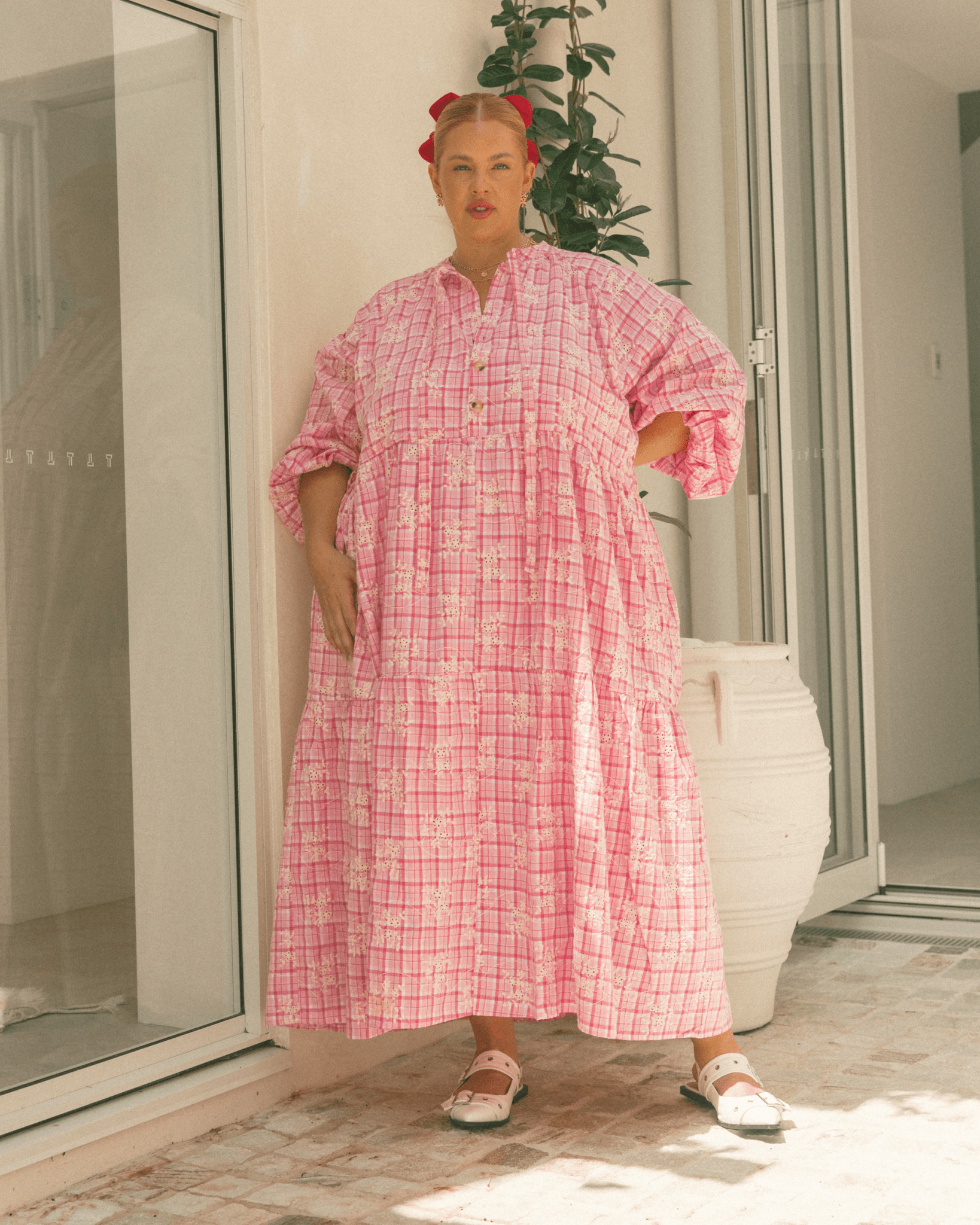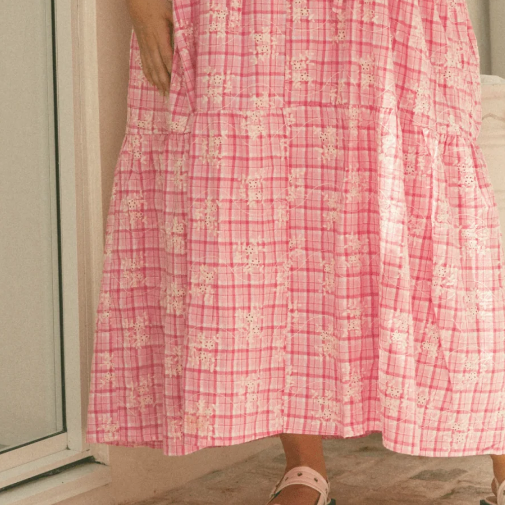 Maxi Avalon Smock Dress | Pink Gingham Embroidery