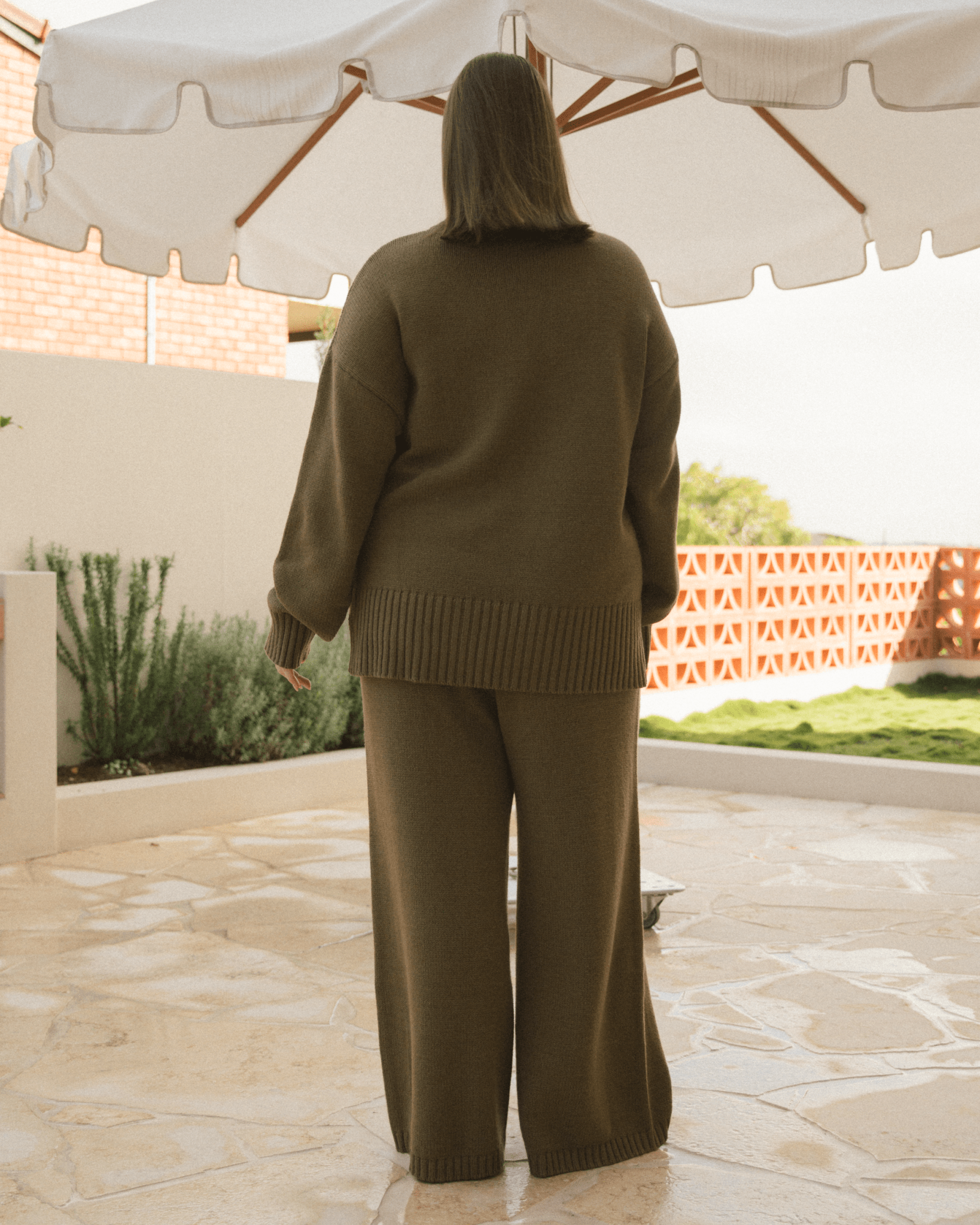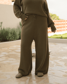 With their relaxed wide-leg silhouette, these pants flatter all body types and provide ultimate ease. The ribbed detailing at the hem and waistband adds a premium finish, while the rich Olive Green tone offers a timeless, elegant palette that transitions beautifully through the seasons.