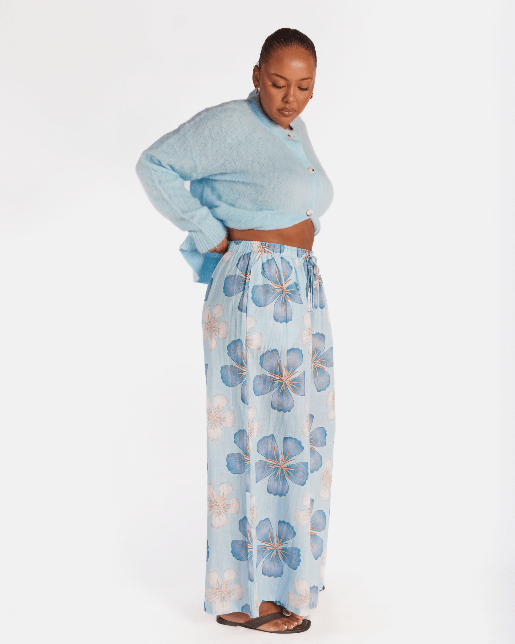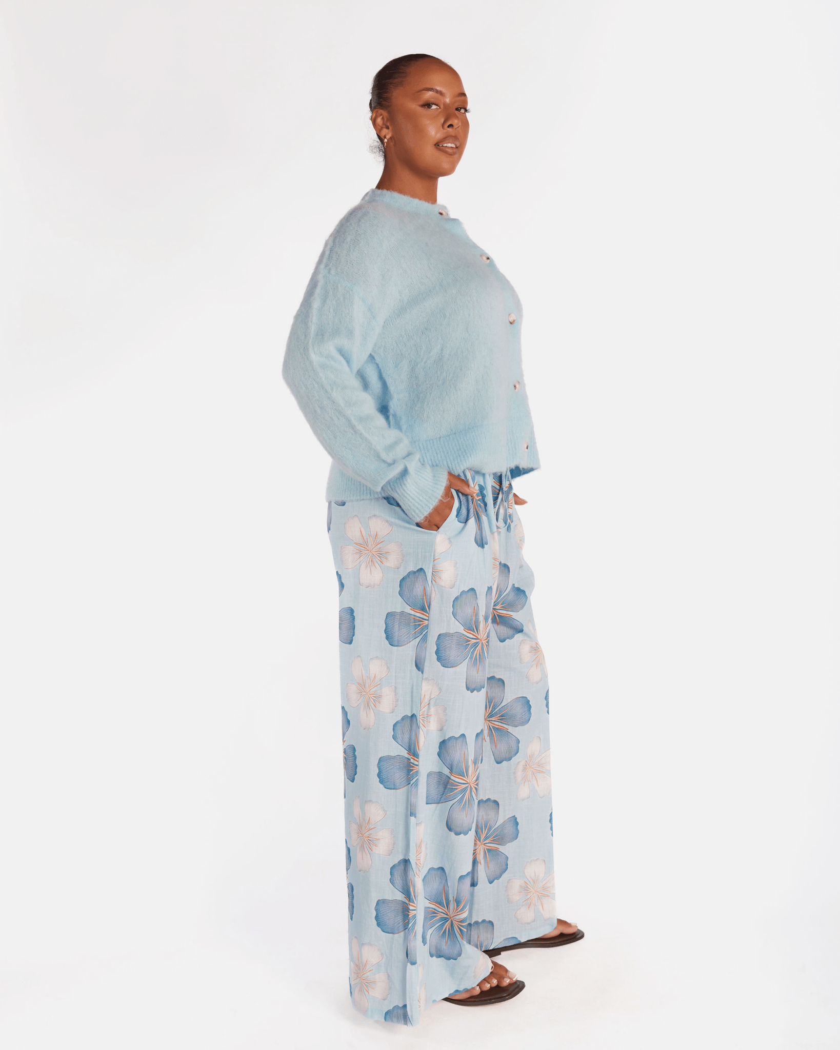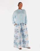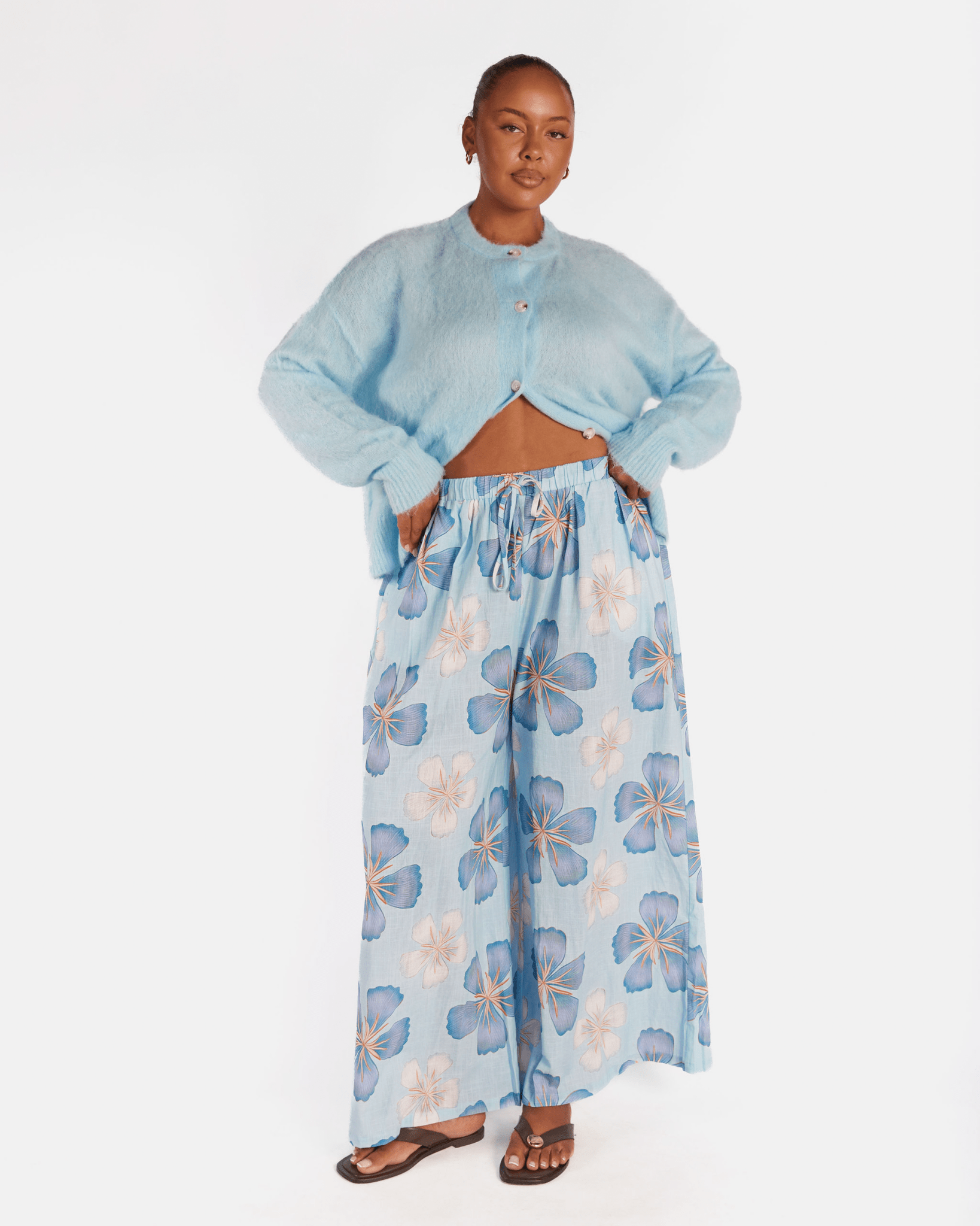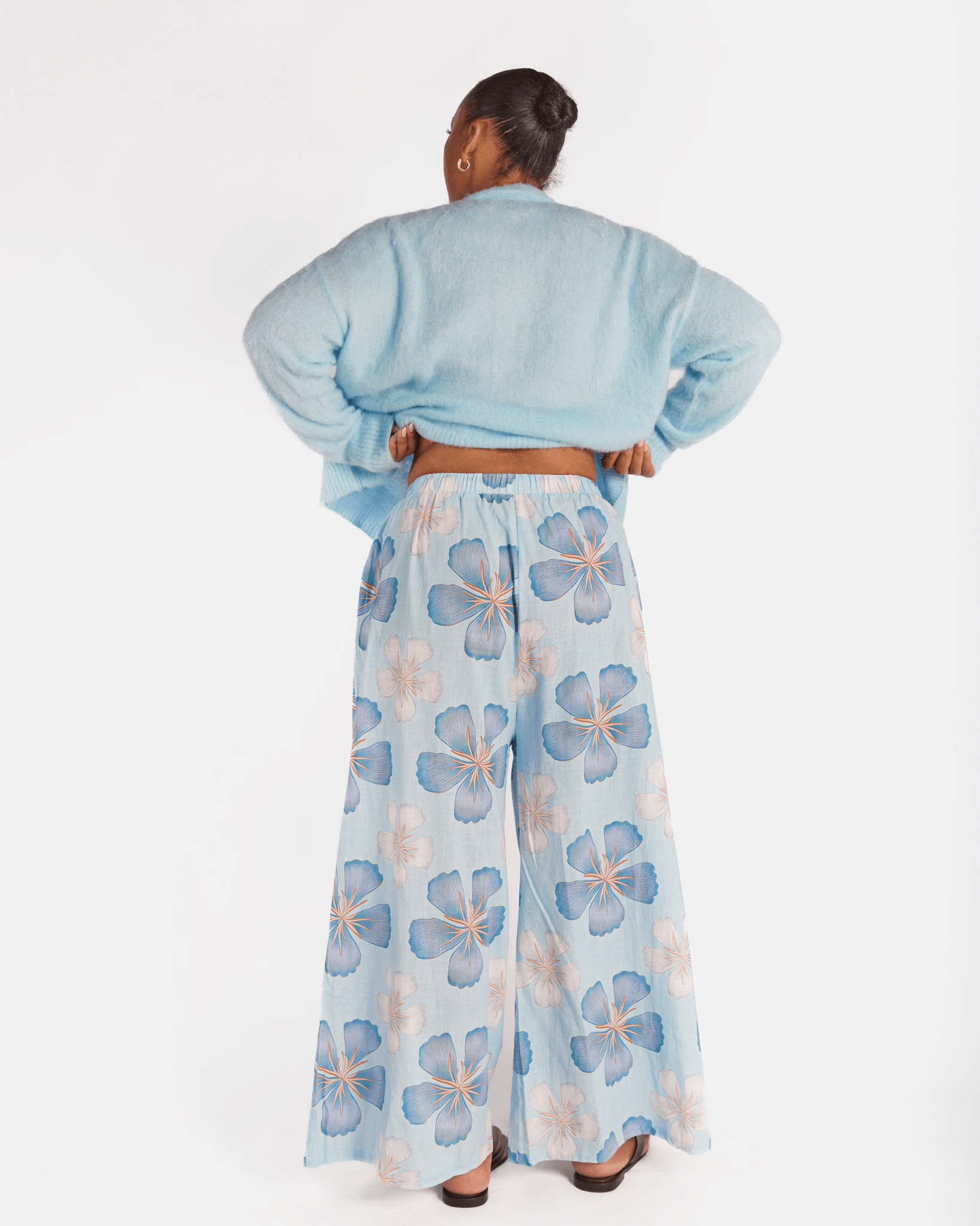 Breathable wide-leg cotton pants in a soft baby blue floral print, designed for comfort through pregnancy, postpartum, and everyday life.