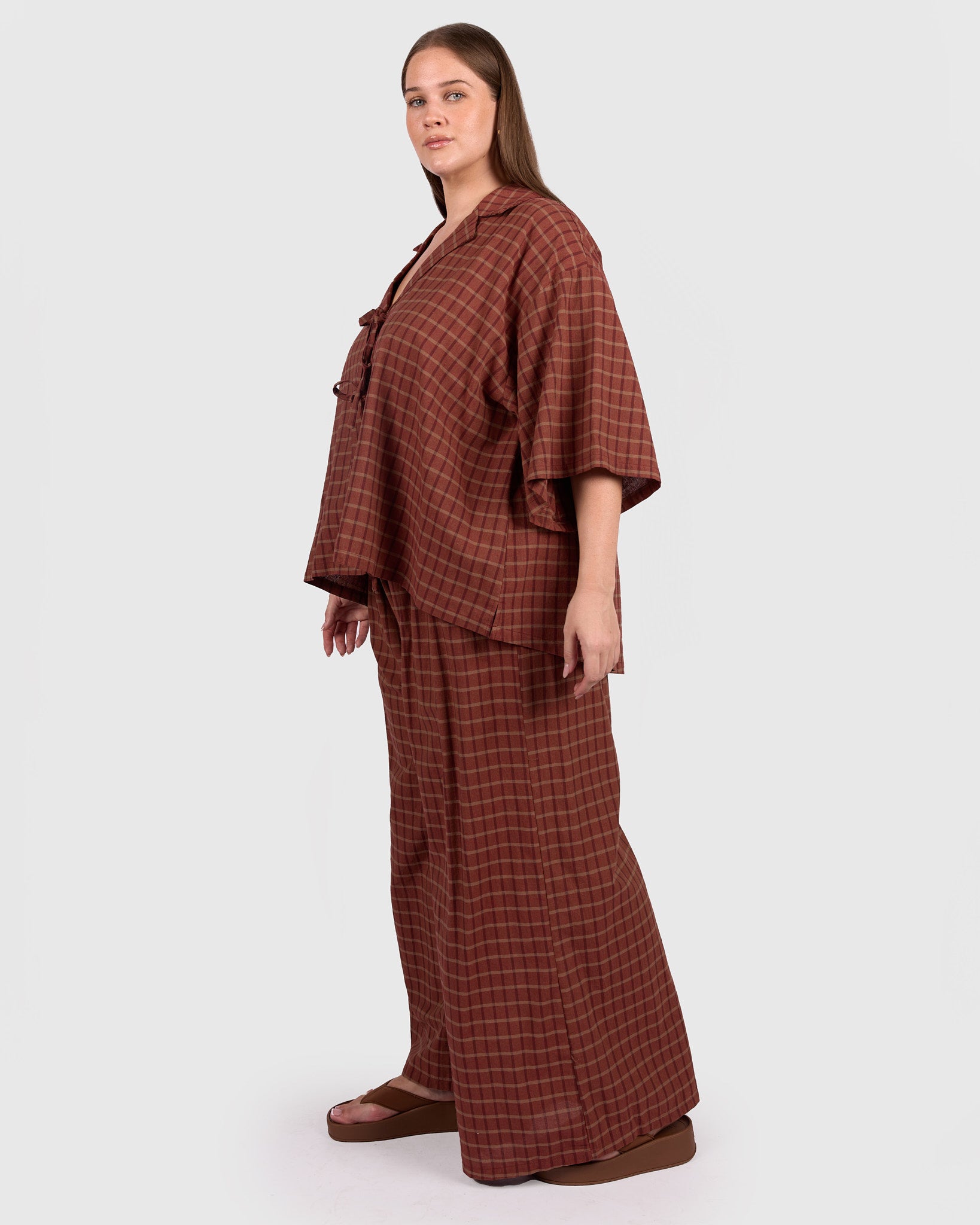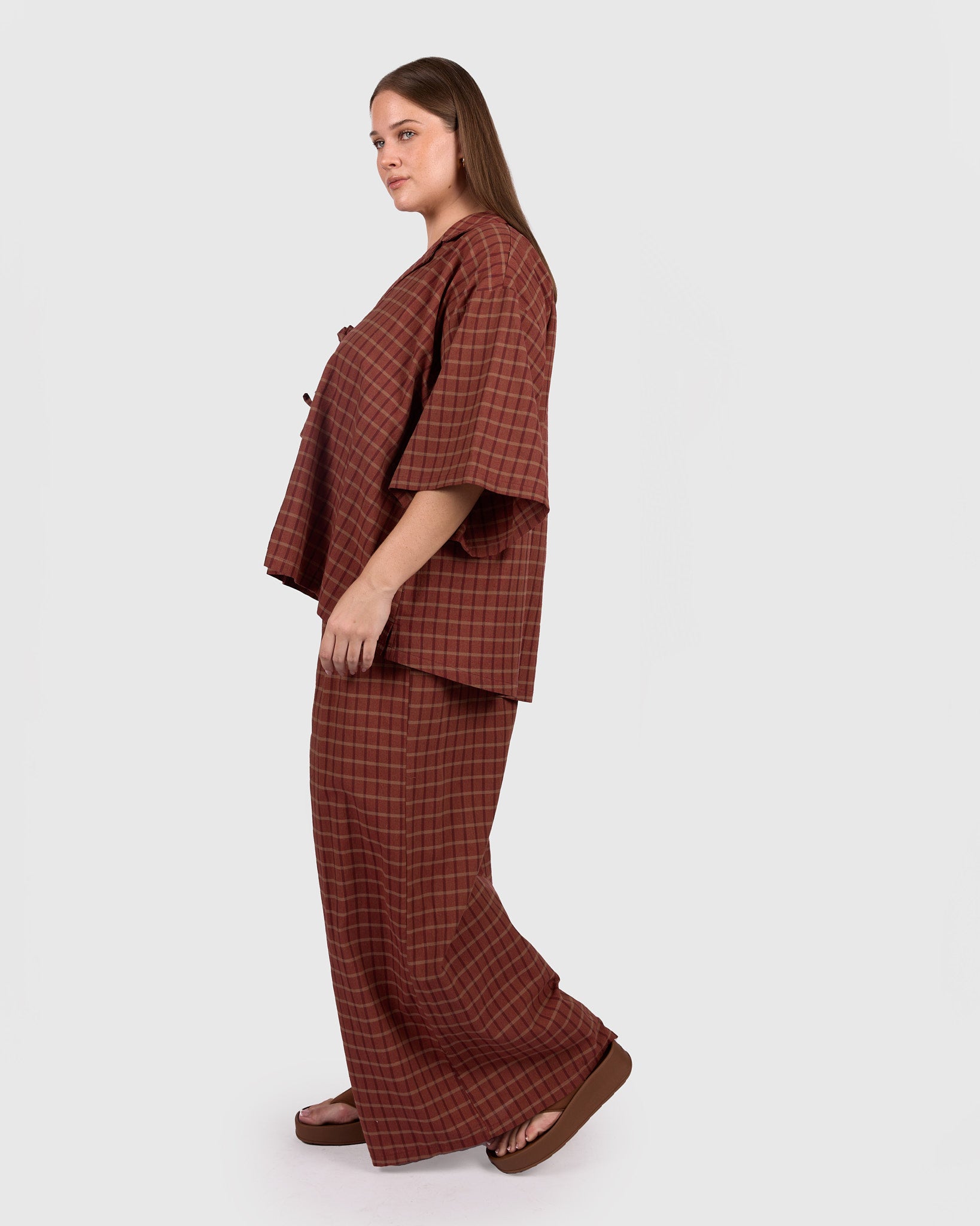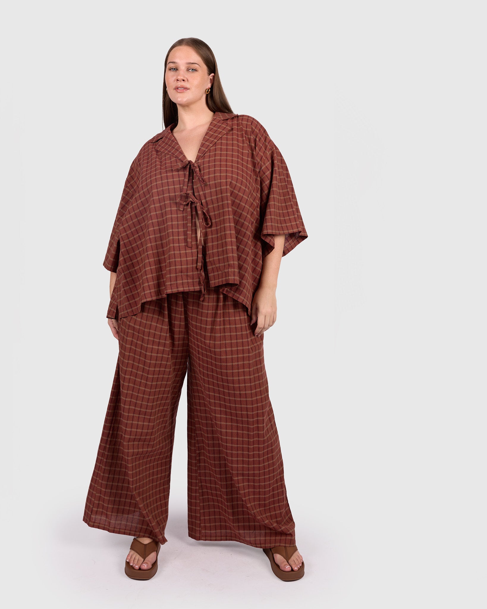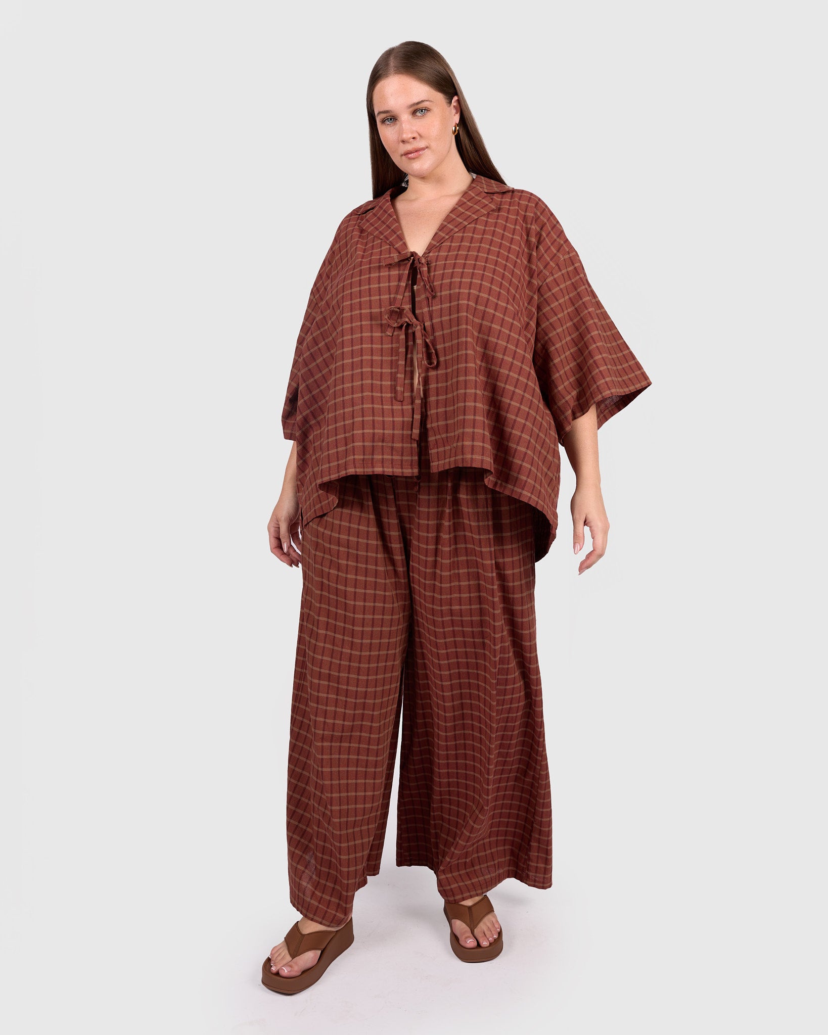 The warm maple gingham print brings an earthy, timeless feel that pairs effortlessly with your wardrobe. Easy to dress up or down, these are the kind of pants you will keep reaching for season after season.