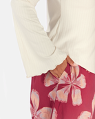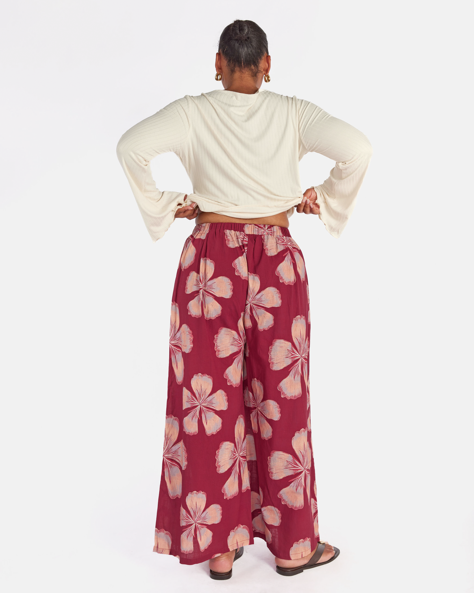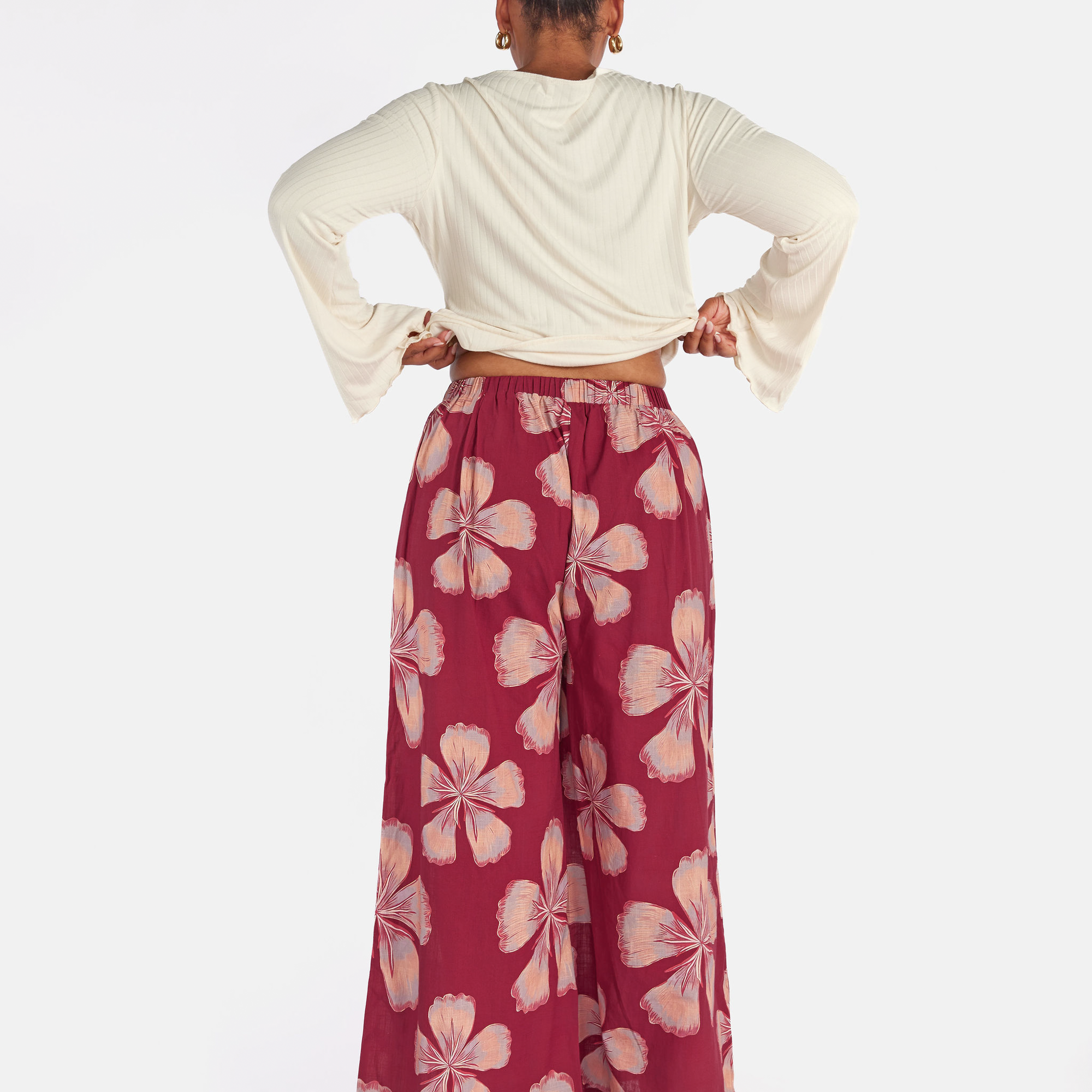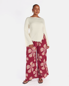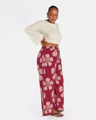 The exclusive Midnight Bloom print showcases oversized hand drawn florals set against a rich maroon background. Soft peach and blush tones bloom across the fabric, creating a warm, bold statement that still feels effortless and wearable.