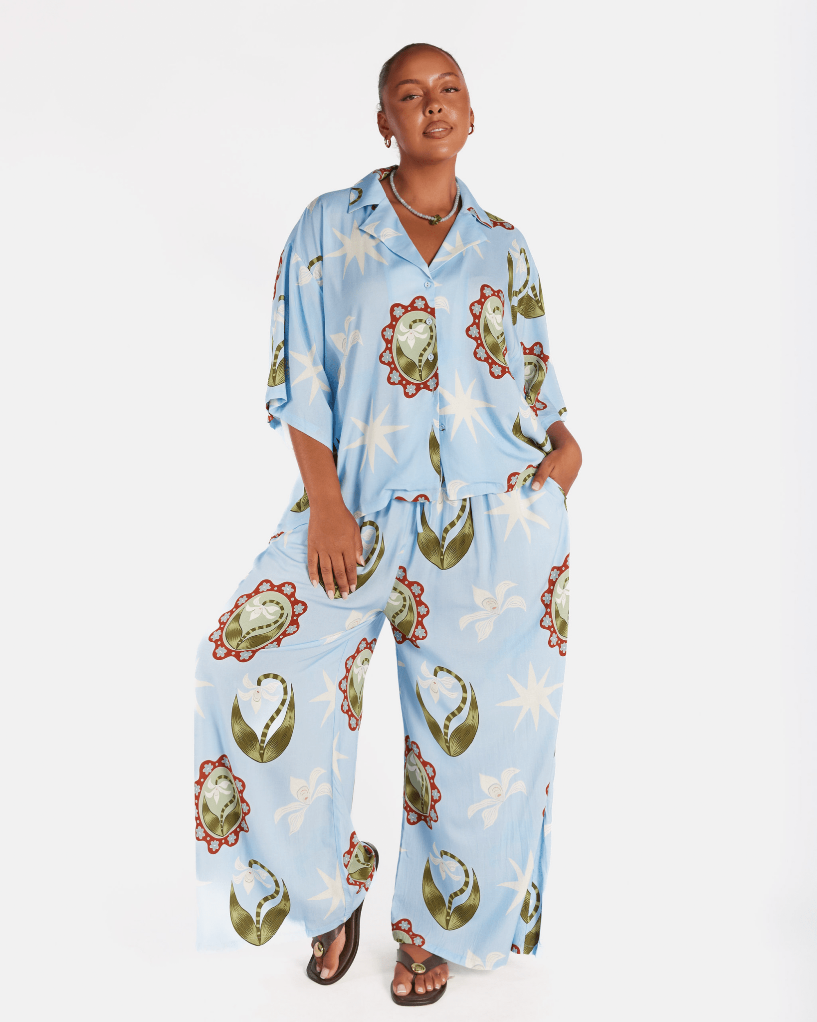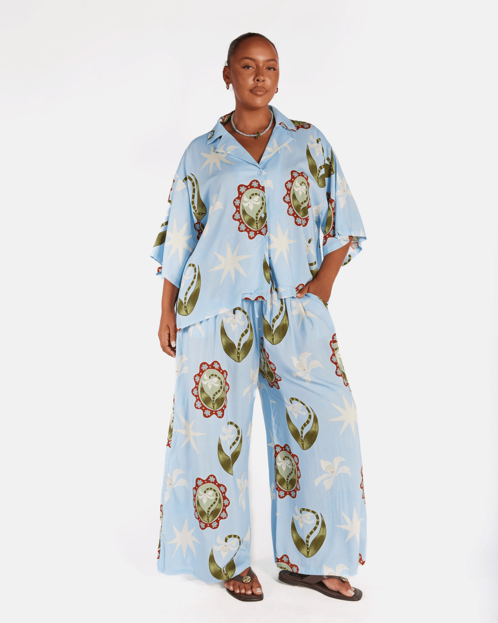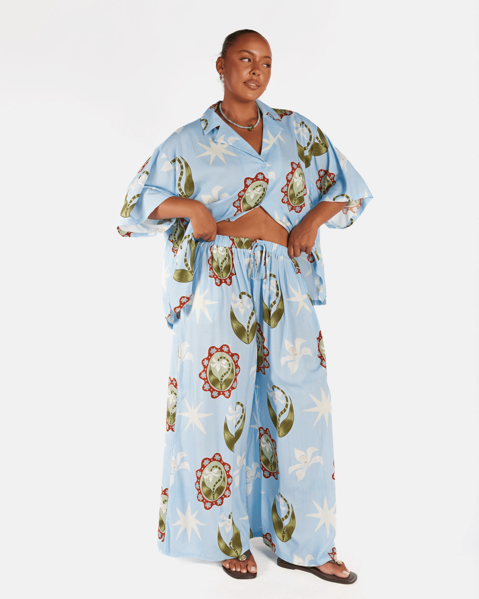 The Posey Pants are designed with a relaxed, floaty fit and a soft drape that sits loosely on the body without clinging. They feature an elasticated waist with a functional drawstring for an adjustable, comfortable fit. If you prefer a less oversized look or are between sizes, we recommend sizing down.