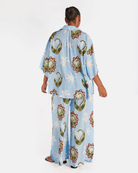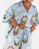 The Moon Flower print is a hand drawn design by Art by Saint, featuring whimsical flowers and stars scattered across a rich blue base. Finished with white, green and maroon accents, it is playful, wearable and just the right amount of special.