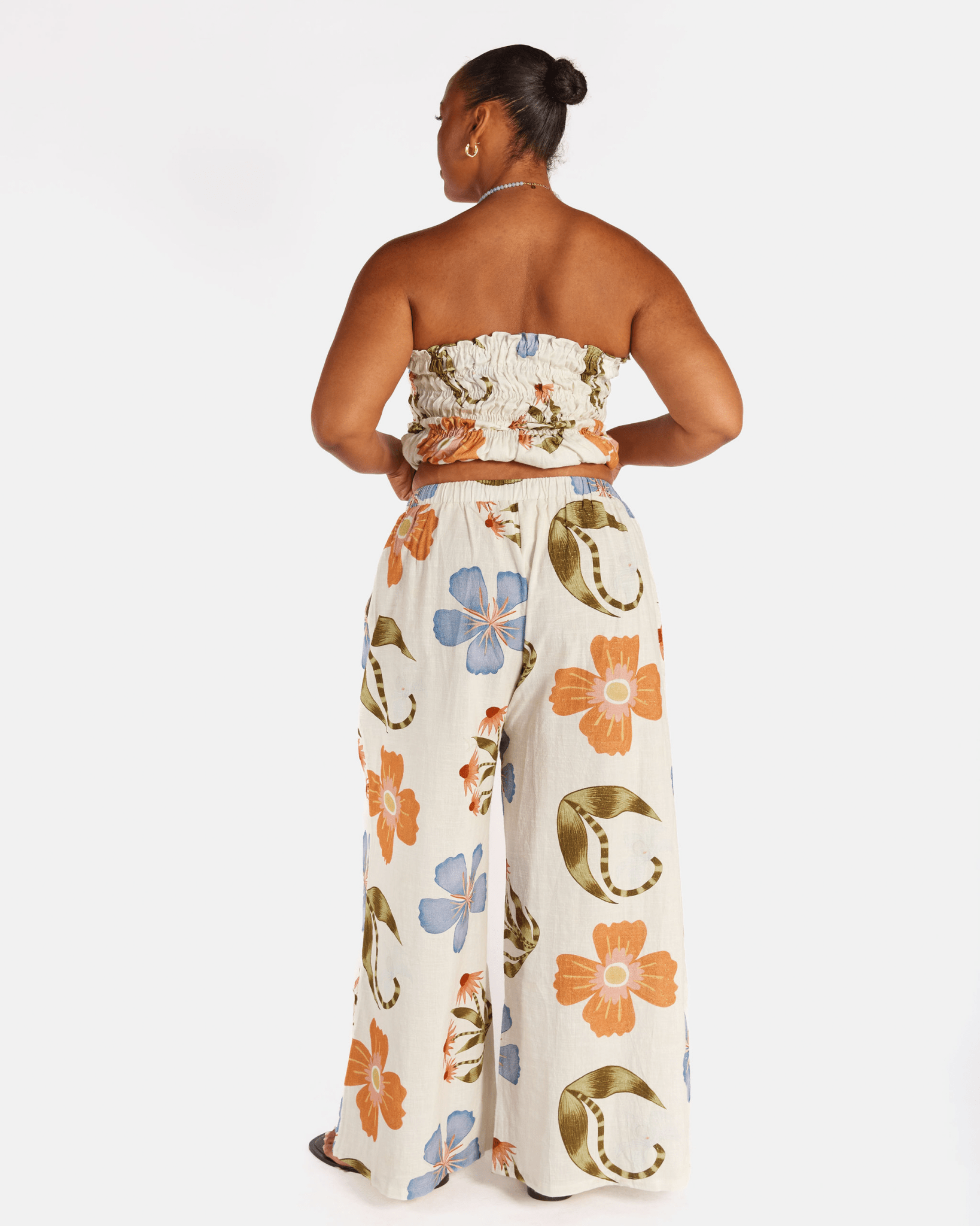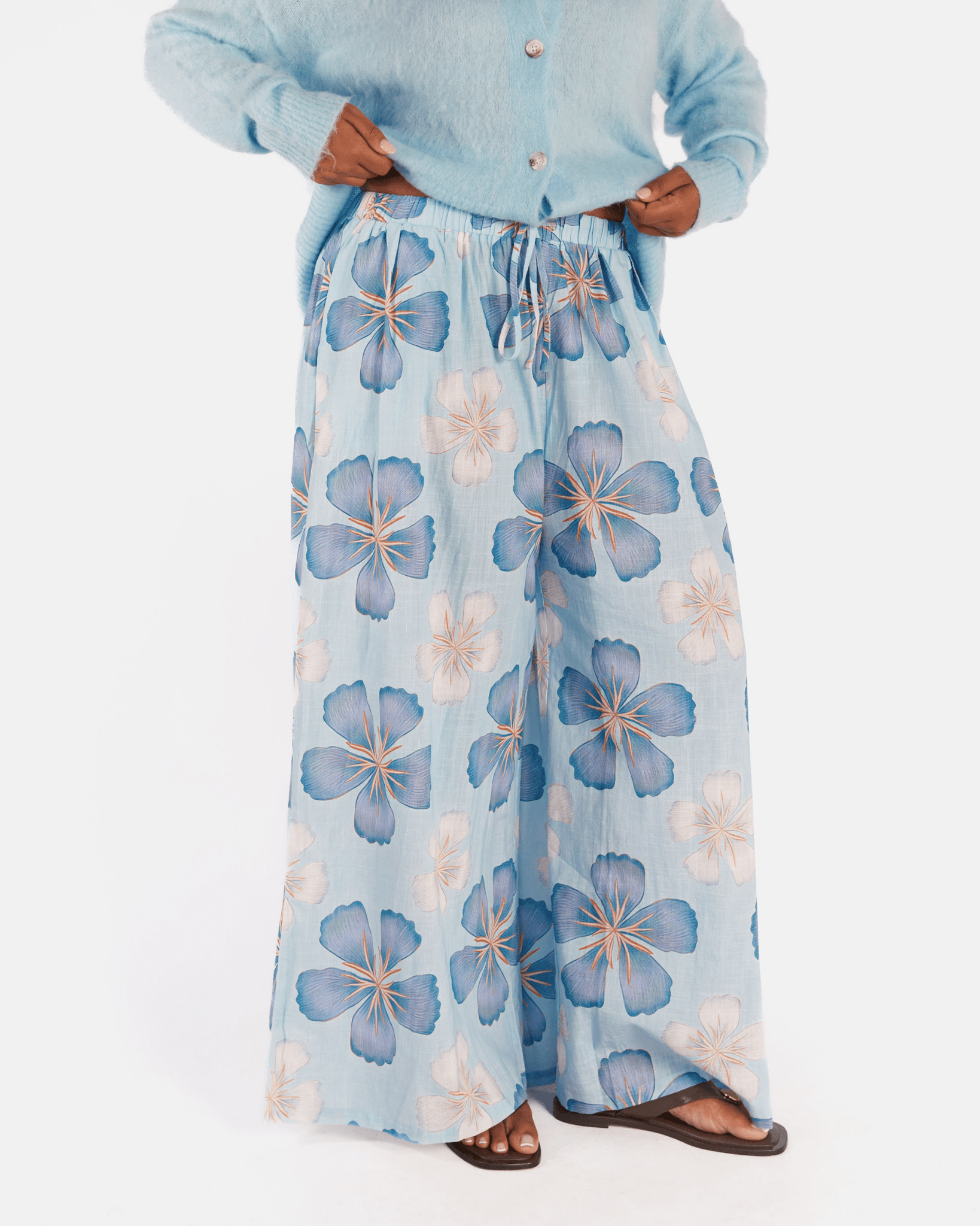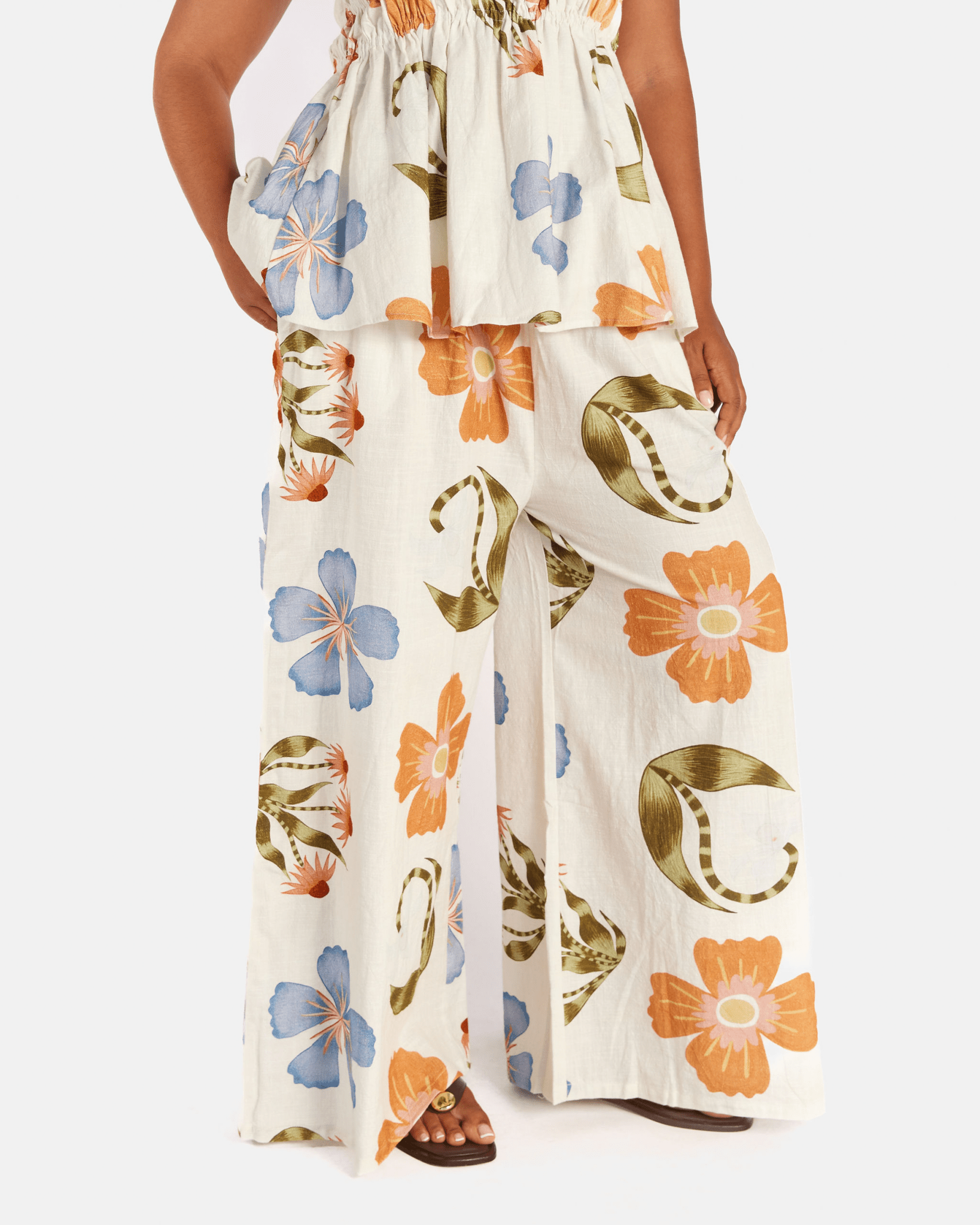 Lightweight cotton slub wide-leg pants with an elastic waist and oversized floral print, designed for comfort, movement, and everyday style.