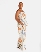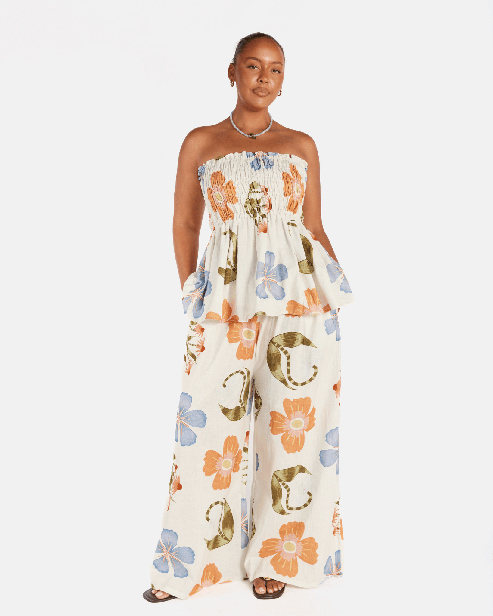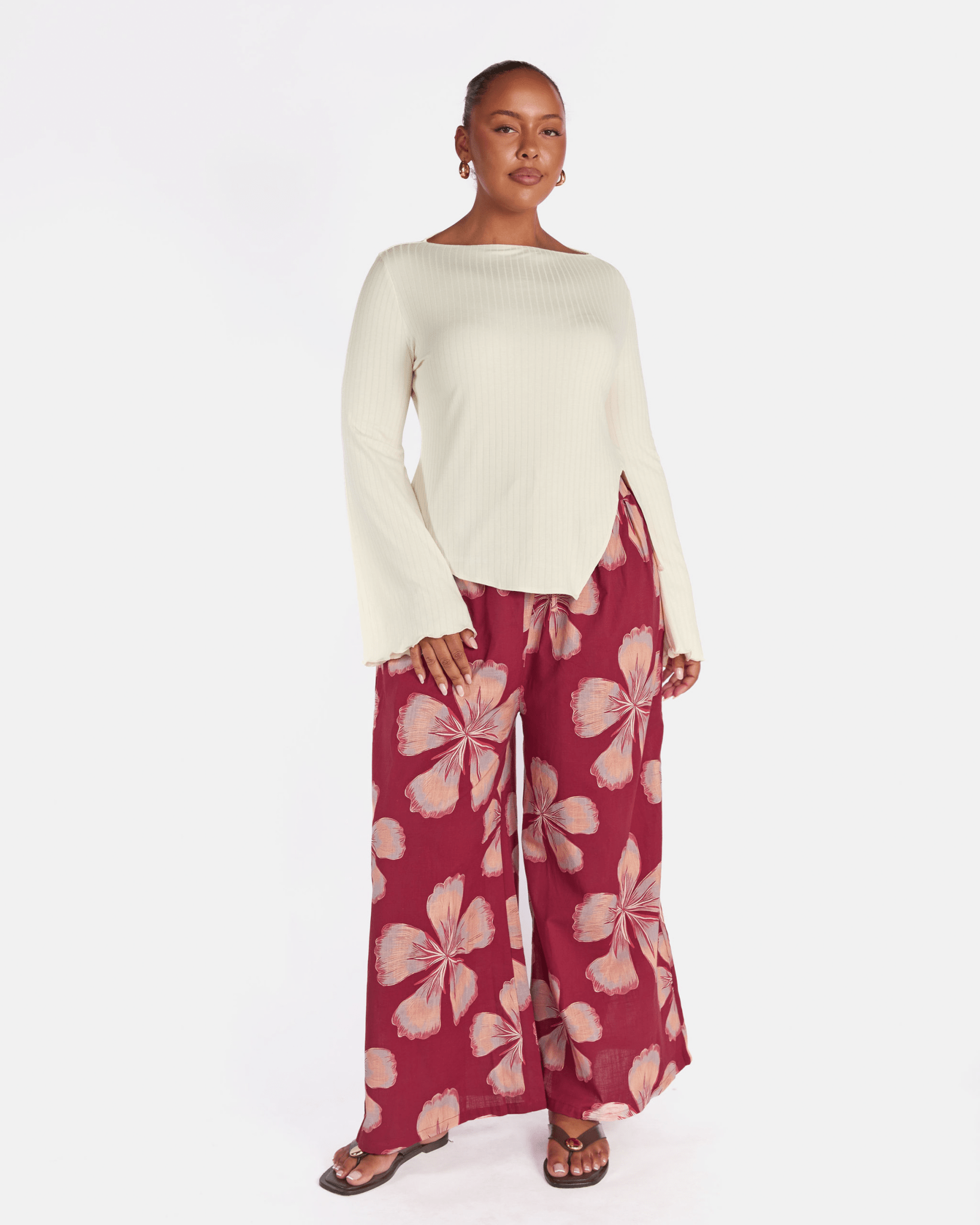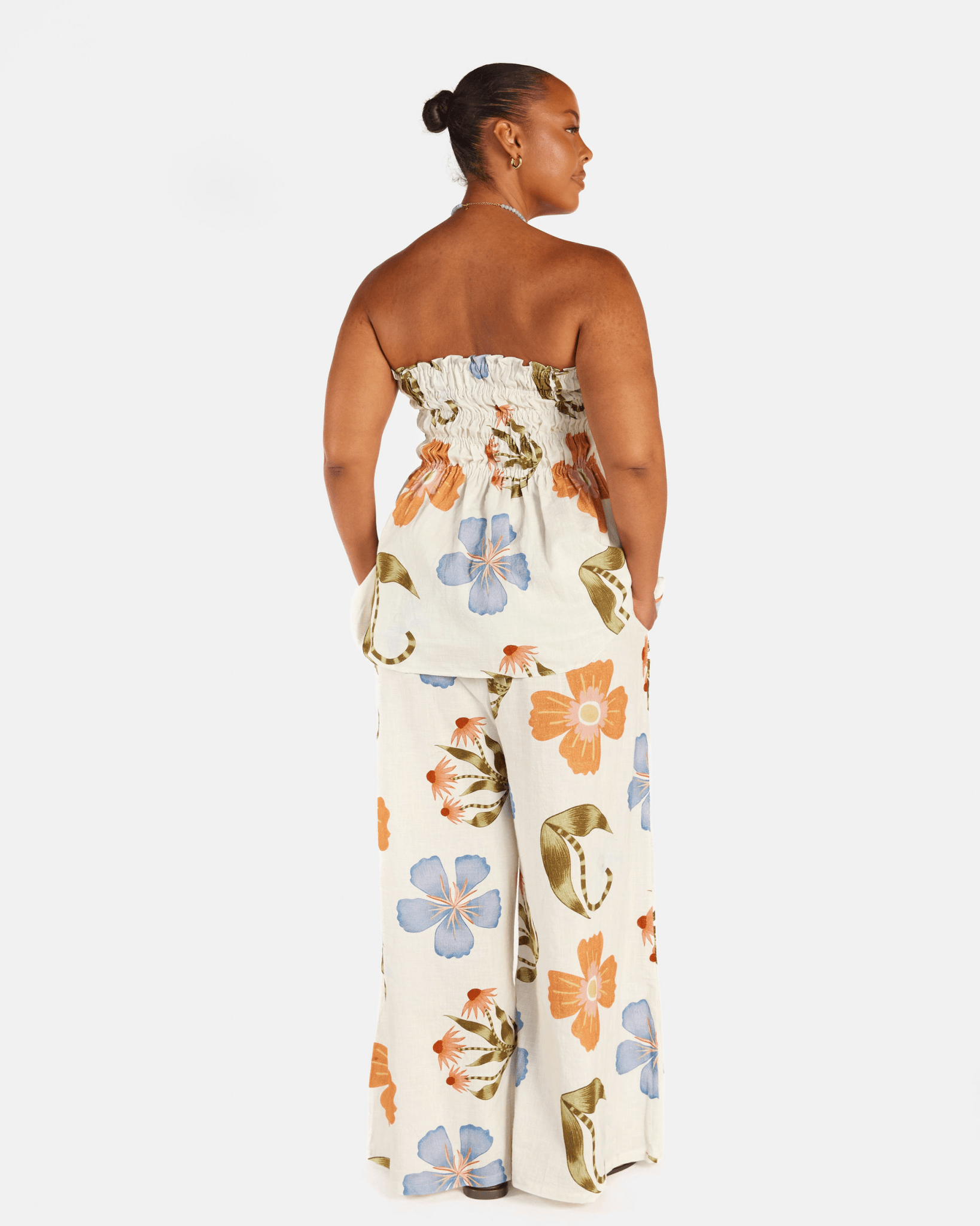 Lightweight cotton slub wide-leg pants with an elastic waist and oversized floral print, designed for comfort, movement, and everyday style.